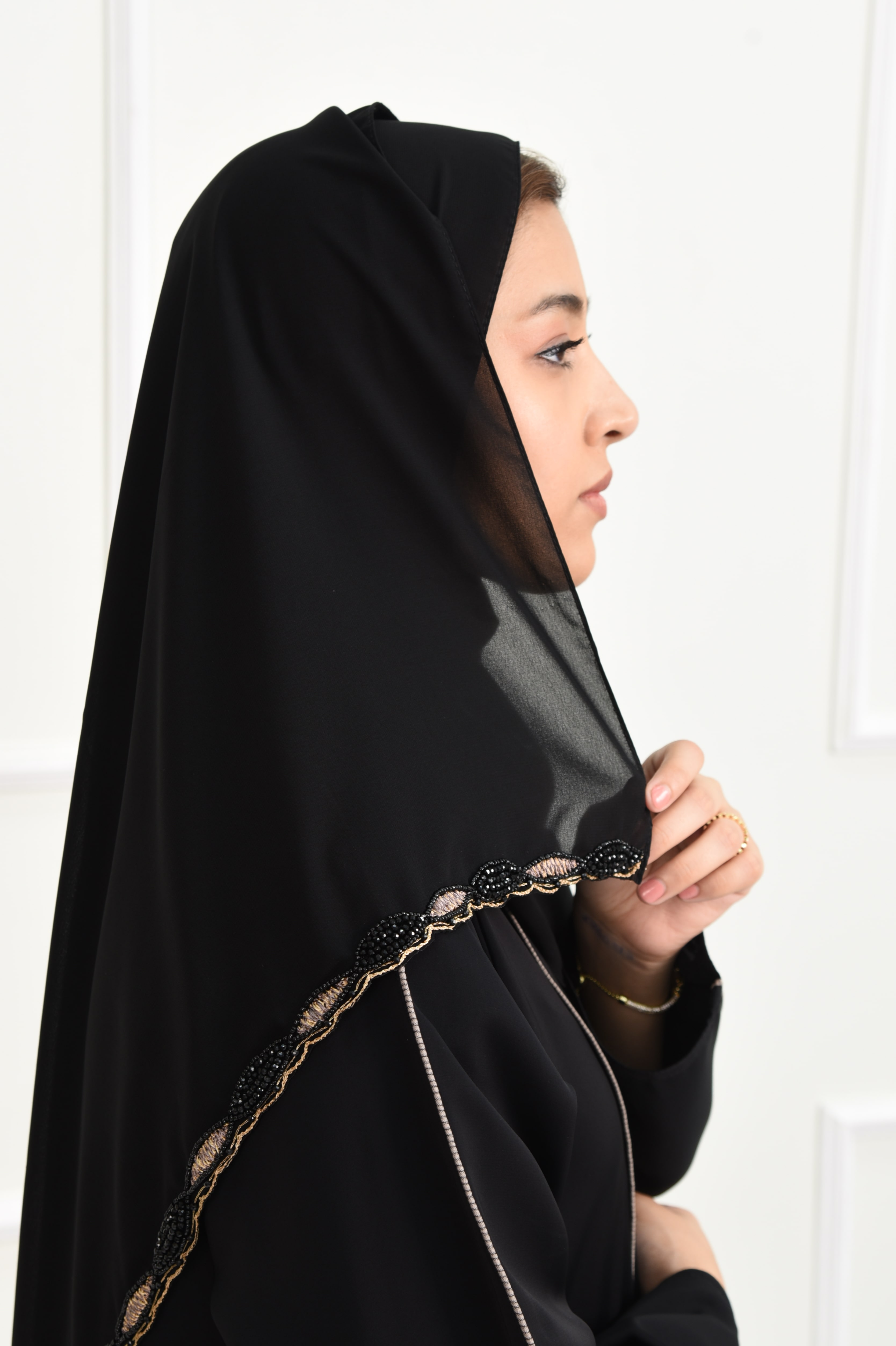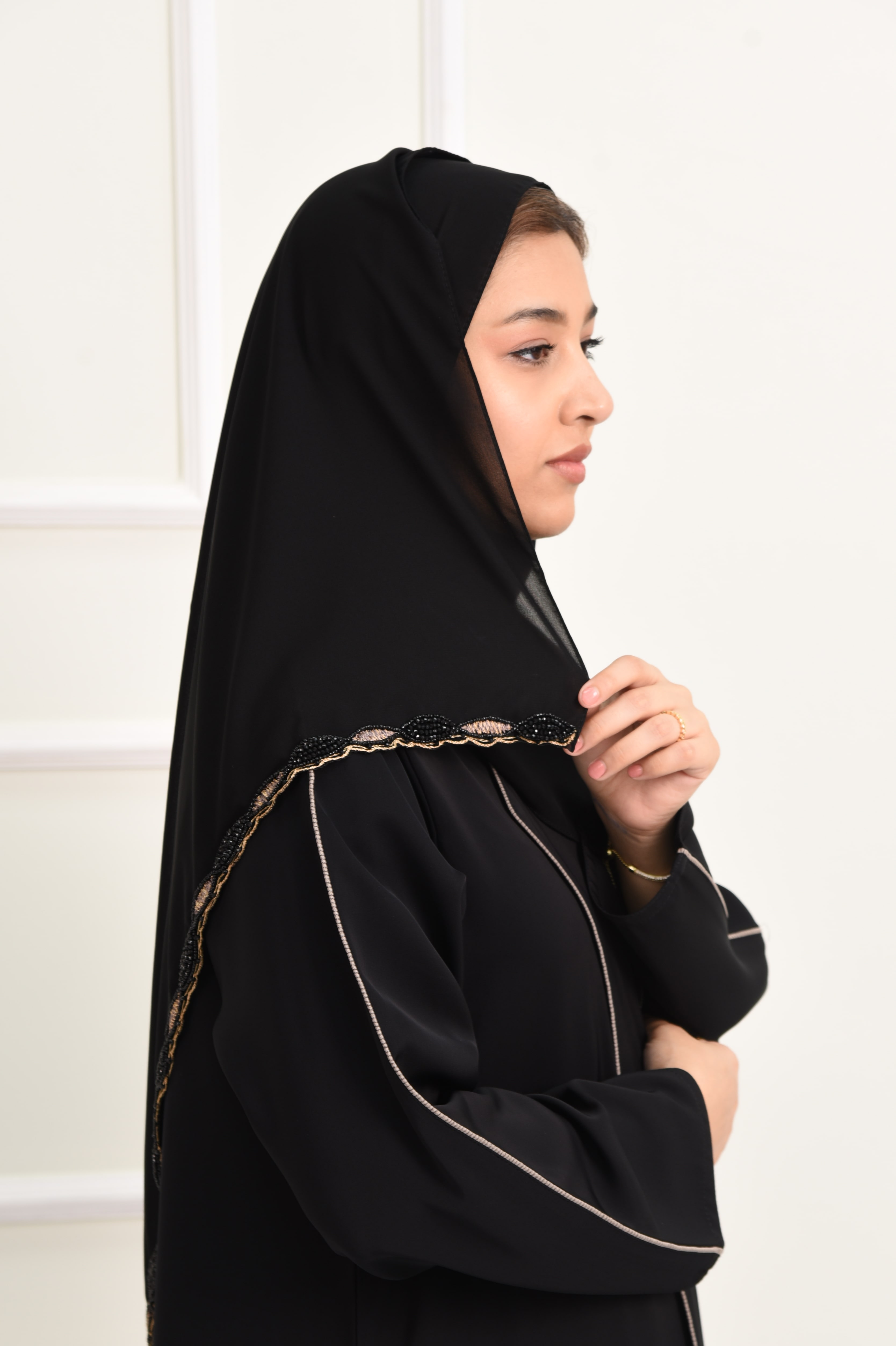 وصف الطرحة: طرحة فاخرة باللون الأسود مزينة بتطريز أنيق بالأسود والبيج على الحواف، لتمنحك لمسة راقية تناسب جميع المناسبات. تصميم كلاسيكي أنثوي يضيف وقاراً وأناقة لإطلالتك.