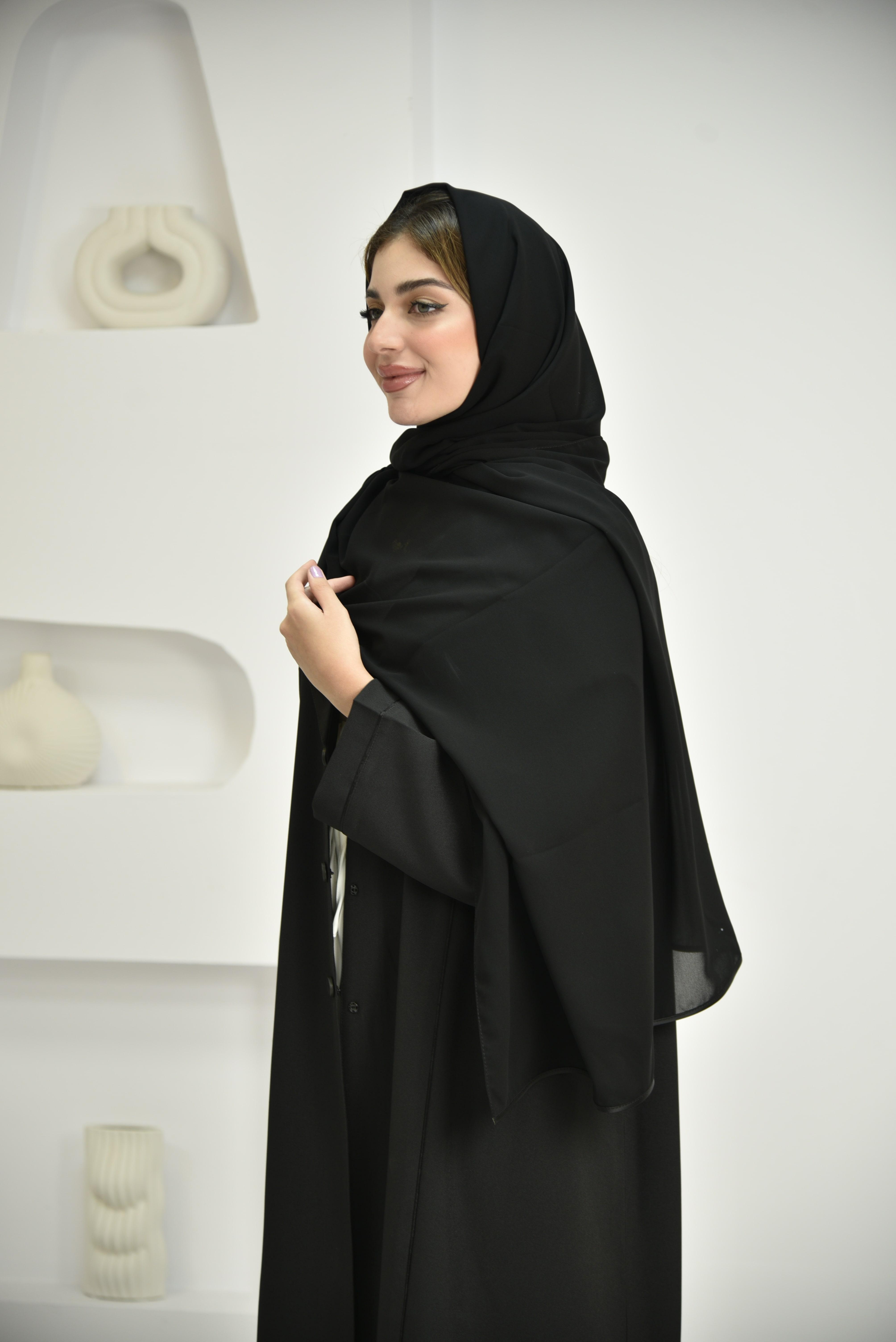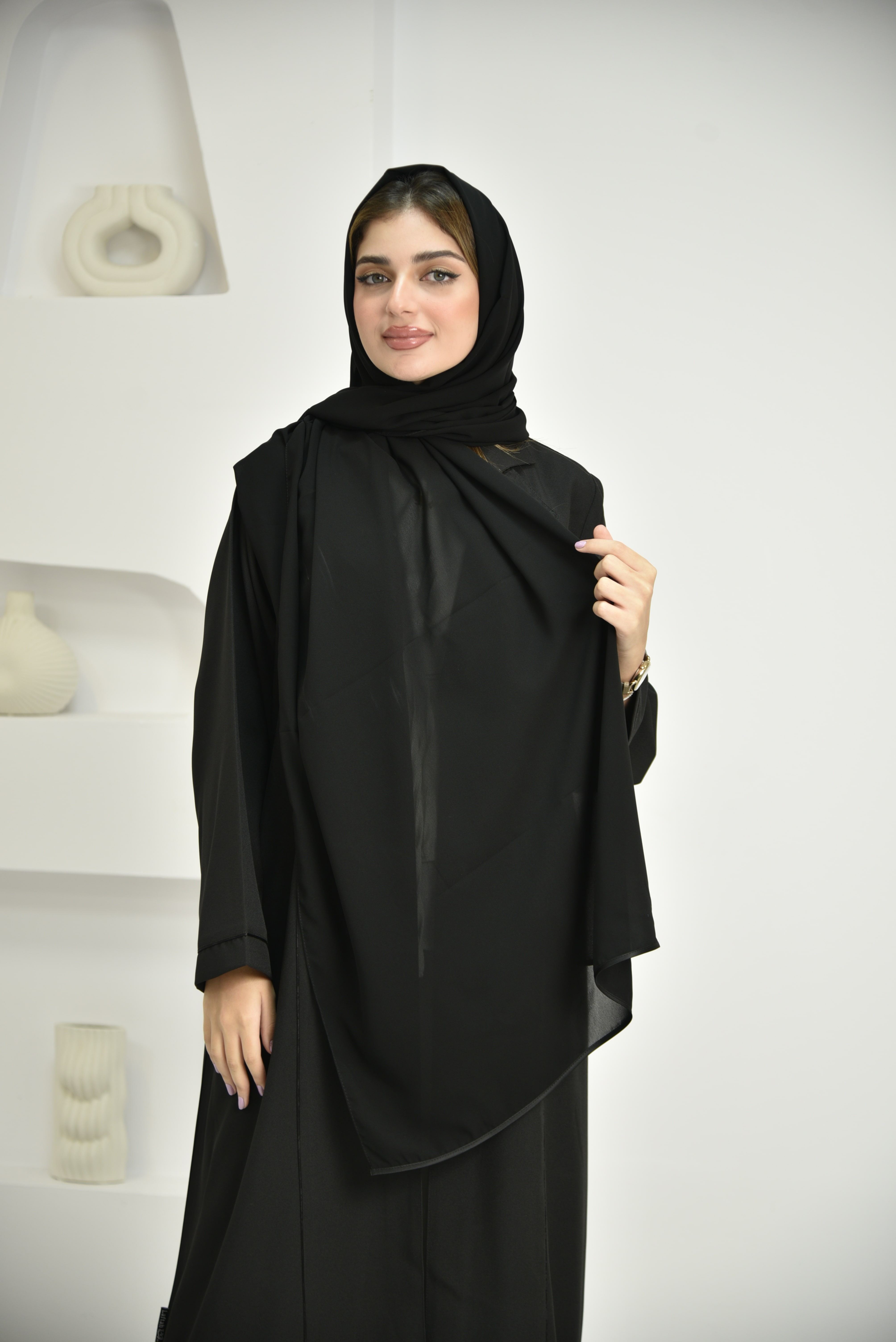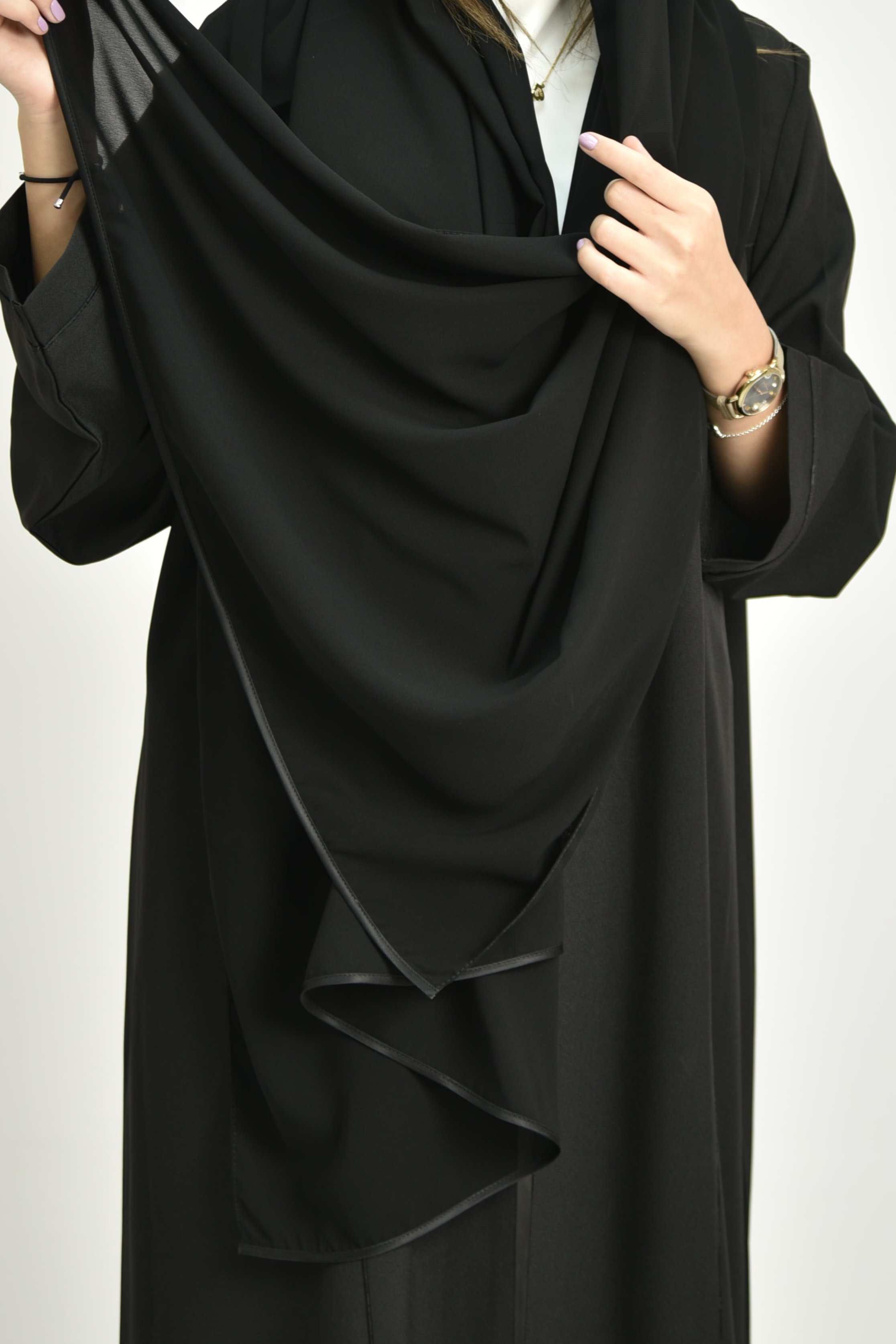 وصف الطرحة: طرحة سادة من قماش ياباني ناعم، بلون أسود، مزينة بشريط ستان على الحافتين.