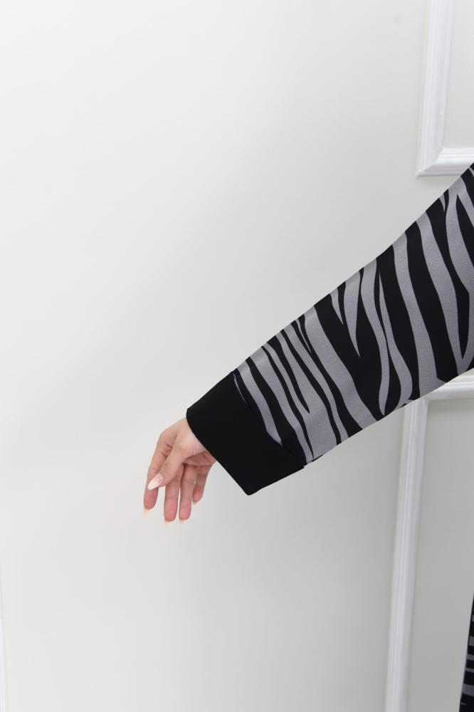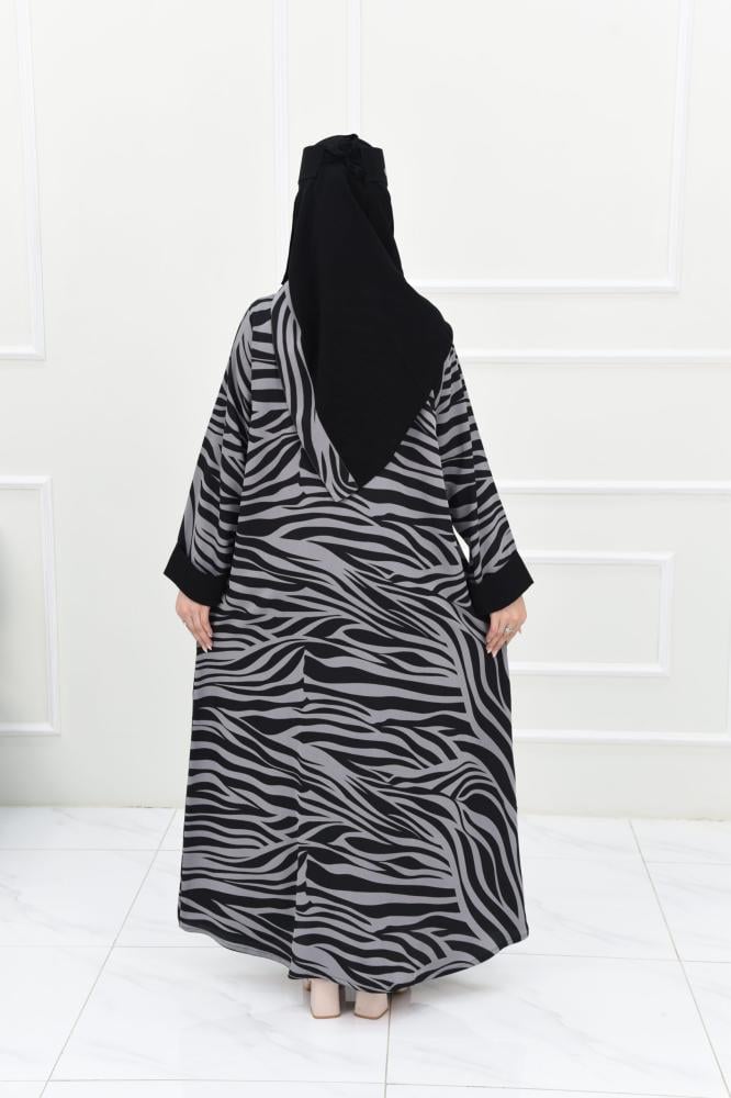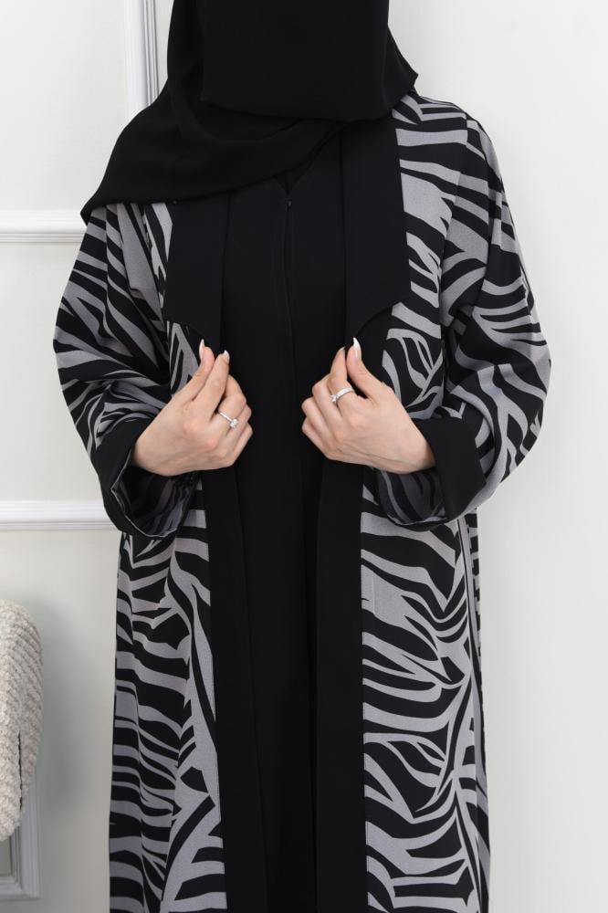 عباية أنيقة بتصميم جذاب، حيث تتداخل الألوان الأسود والرمادي بشكل راقٍ. الأكمام باللون الأسود مقلوبة، مما يمنحها لمسة عصرية، بينما تمتد الياقة المصممة بشكل فريد إلى أسفل العباية، مما يضيف شعورًا بالانسيابية.
