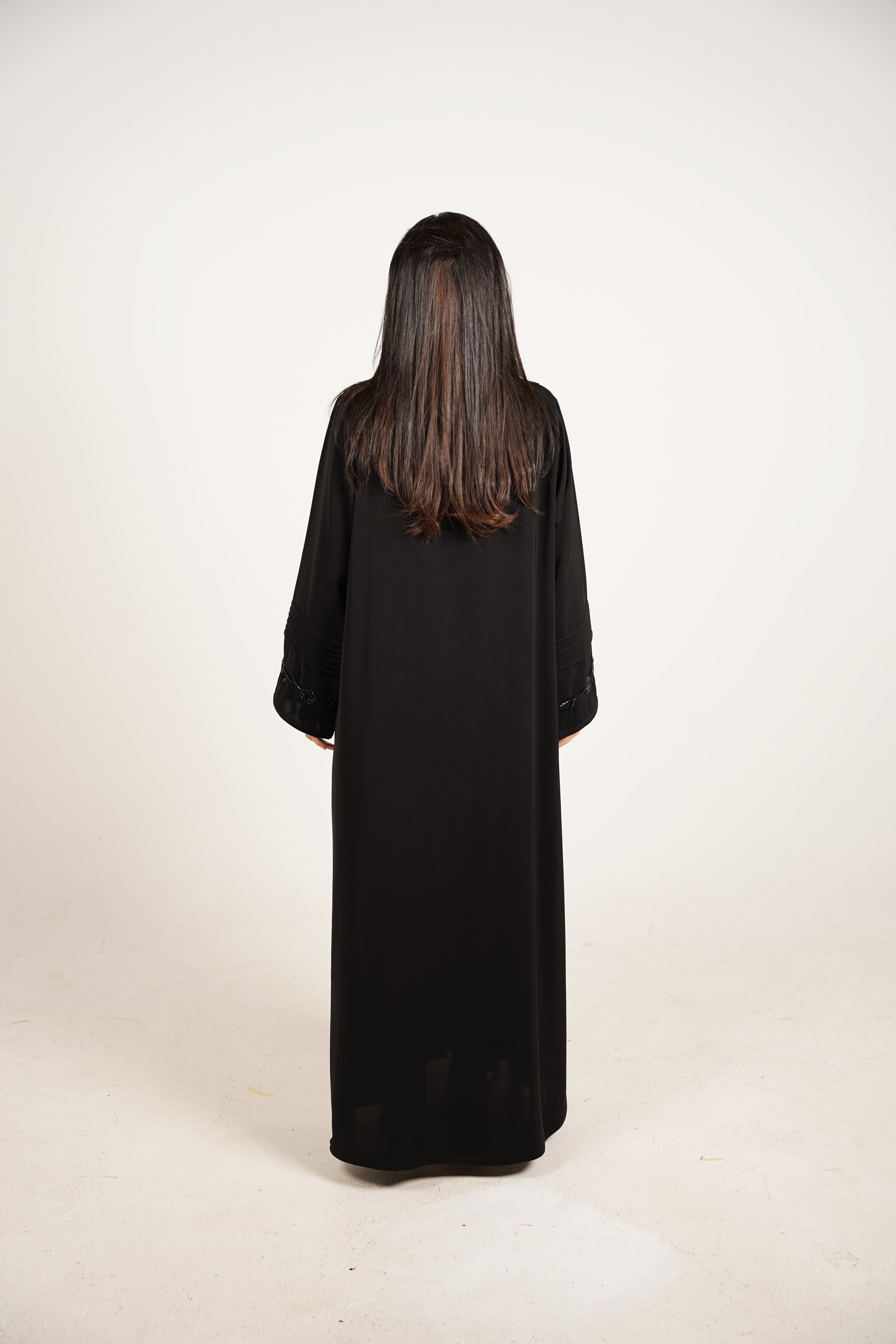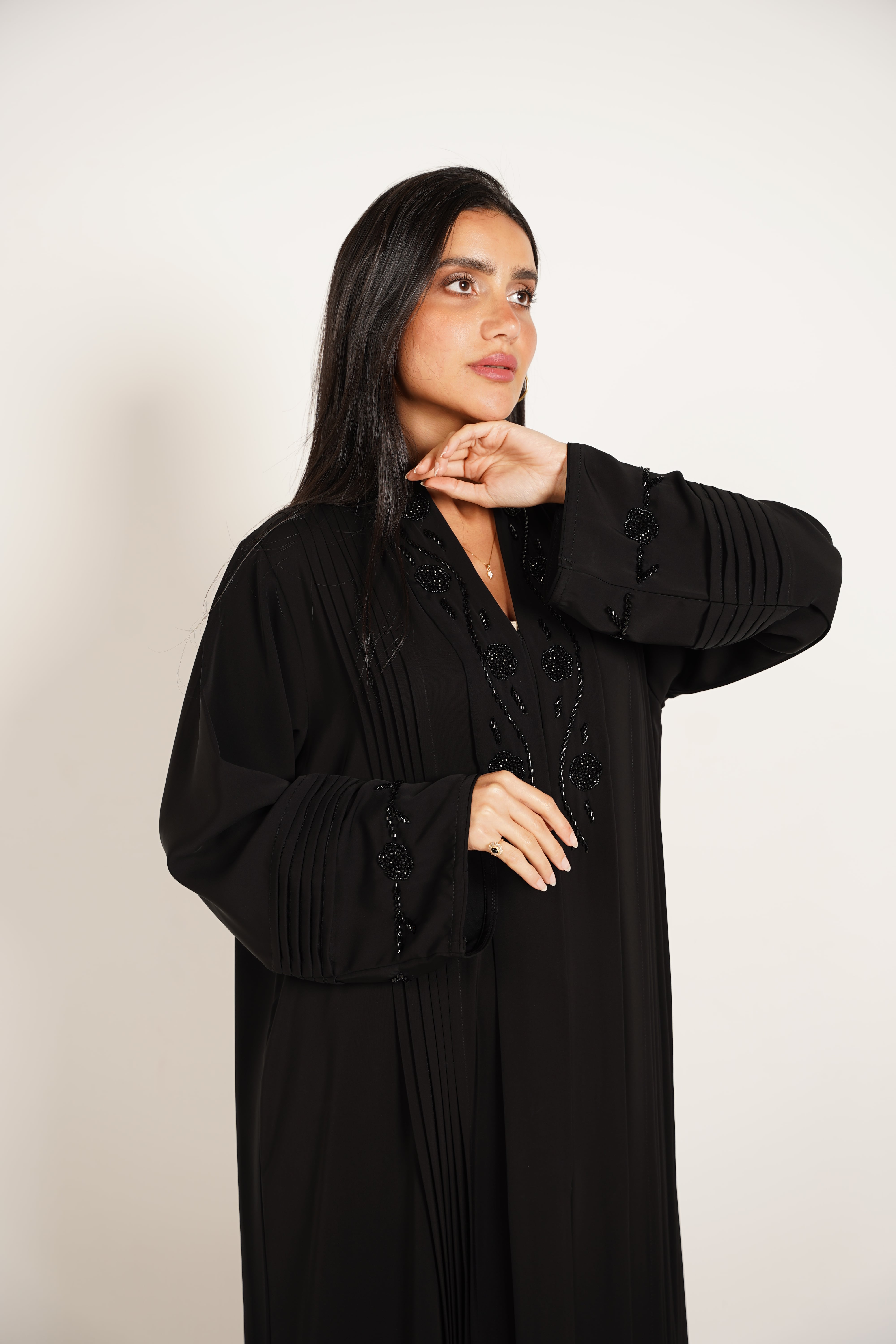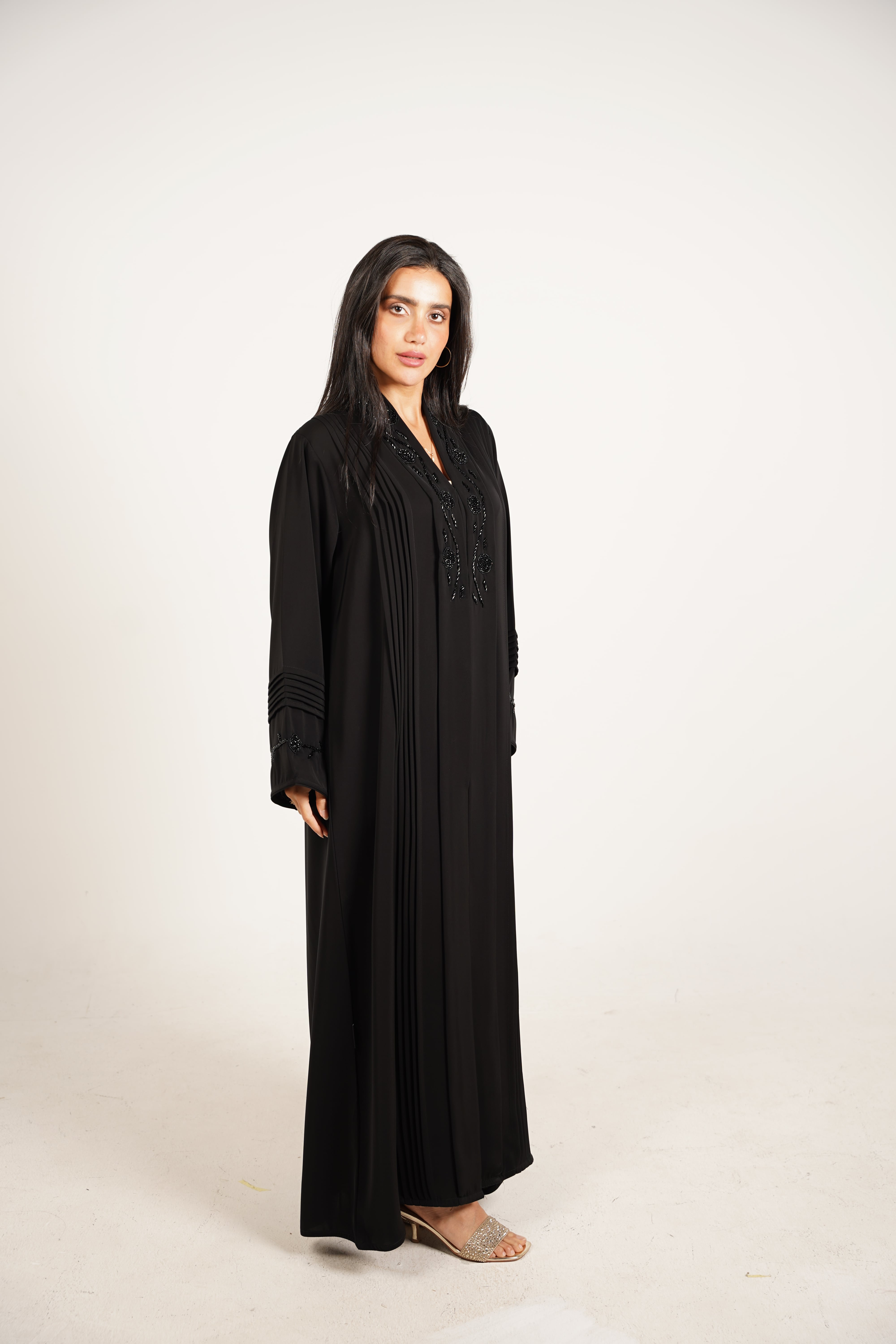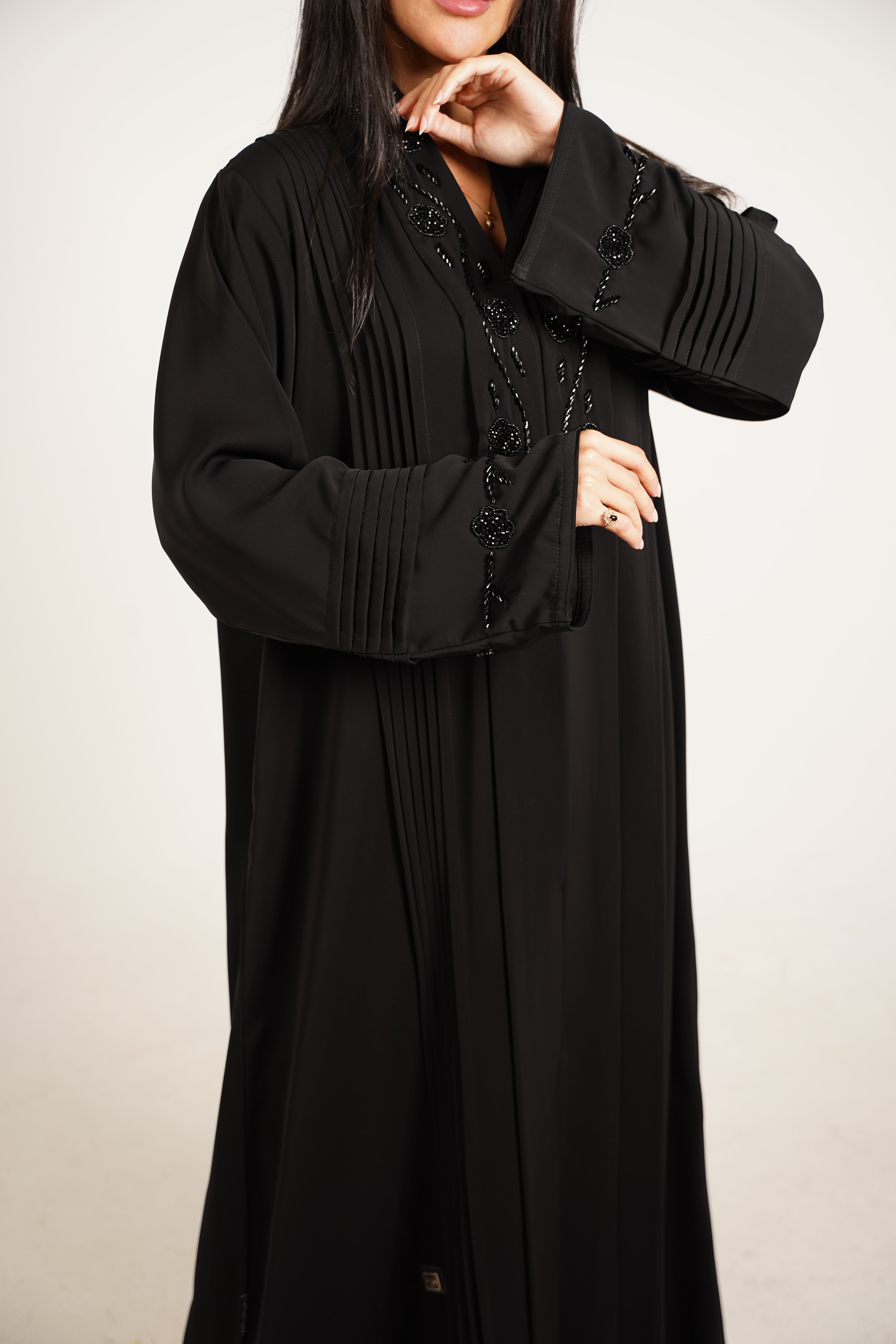 وصف العباية: عباية مصممة من قماش ناعم وفاخر، تتميز بتطريز أنيق على الصدر والأكمام يضيف لمسة من الفخامة، بالإضافة إلى كسرات دقيقة تعزز من تنسيق القماش وتمنحها طابعًا عصريًا ومميزًا.