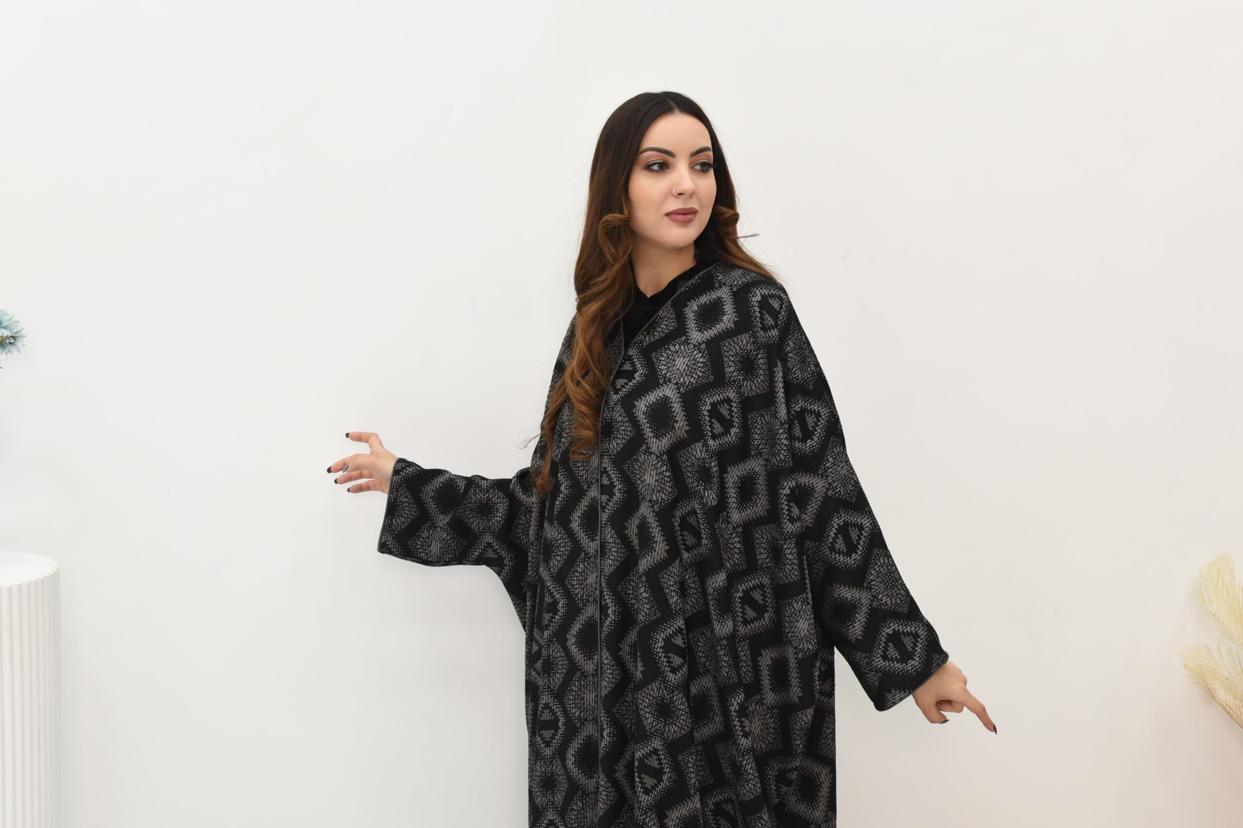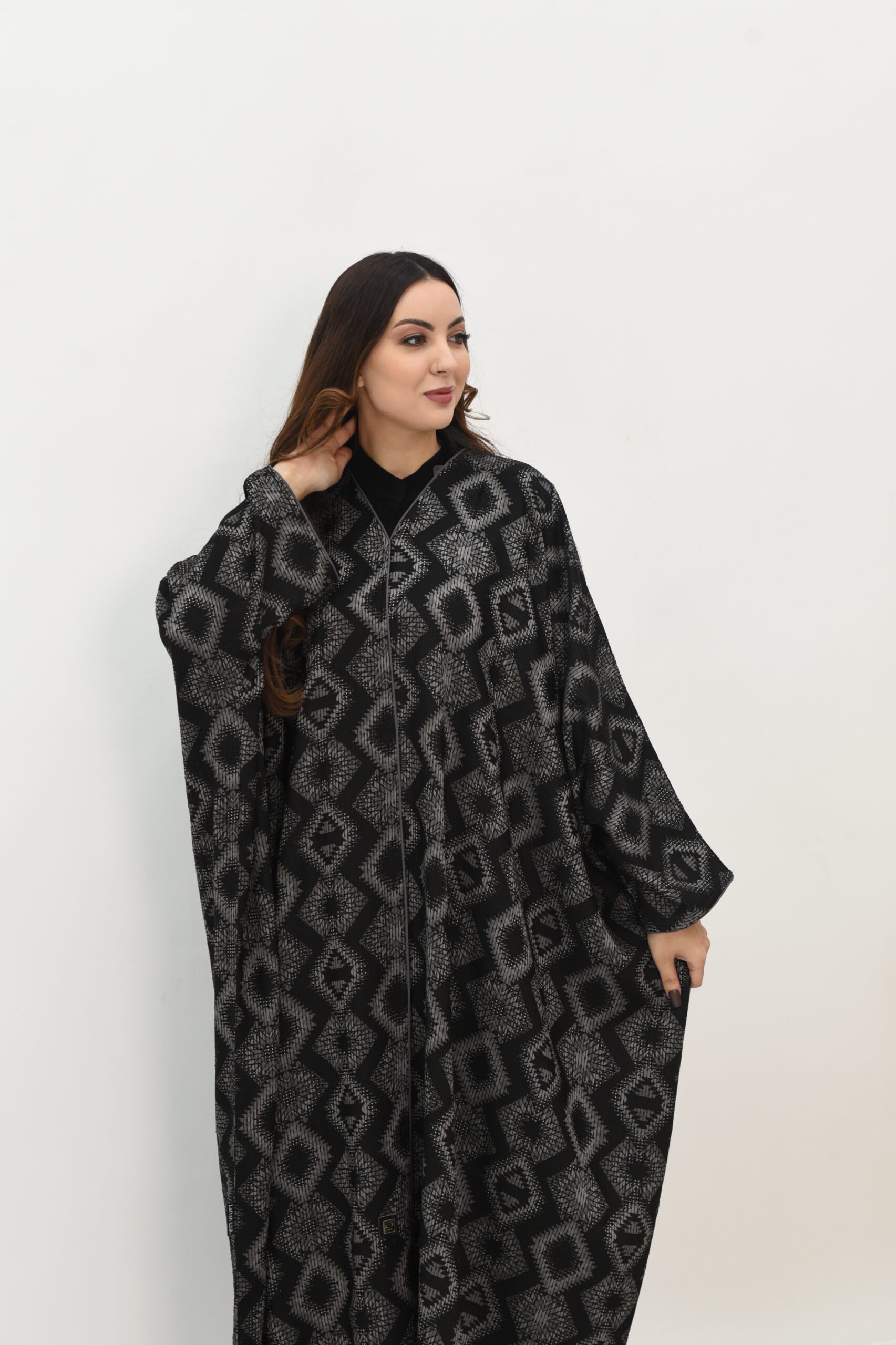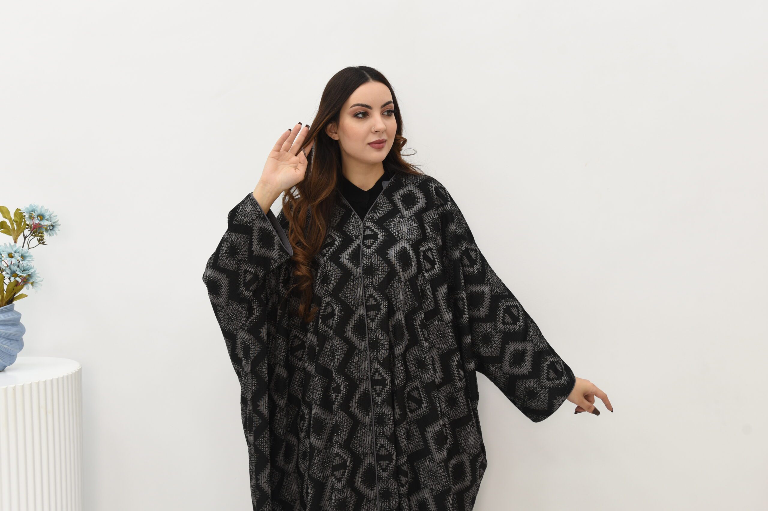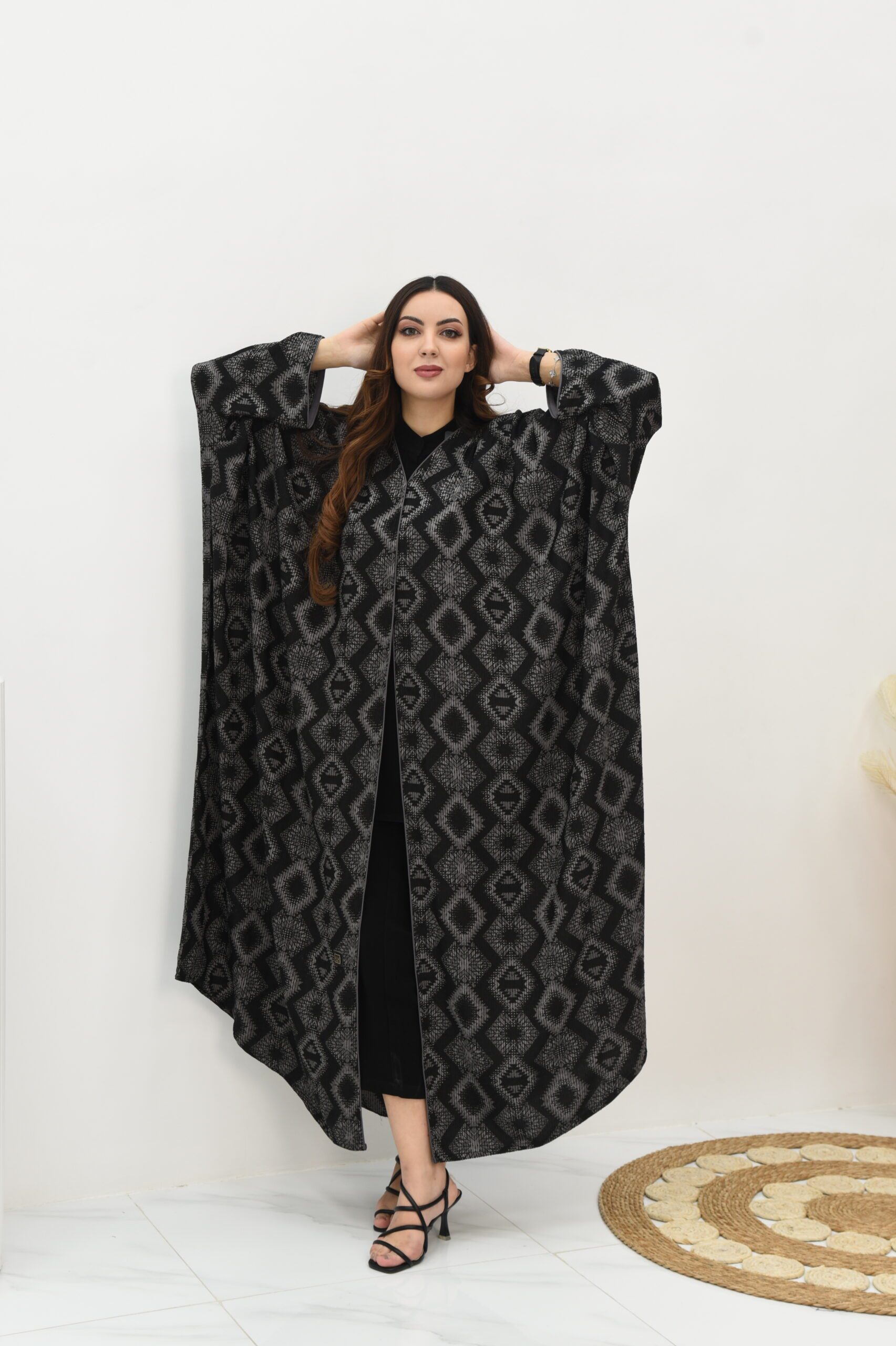 وصف العباية: عباية بقَصَّة البشت بلون أسود ,والرمادي، مصممة من قماش الجاكار ، مما يضفي لمسة راقية وجميلة.