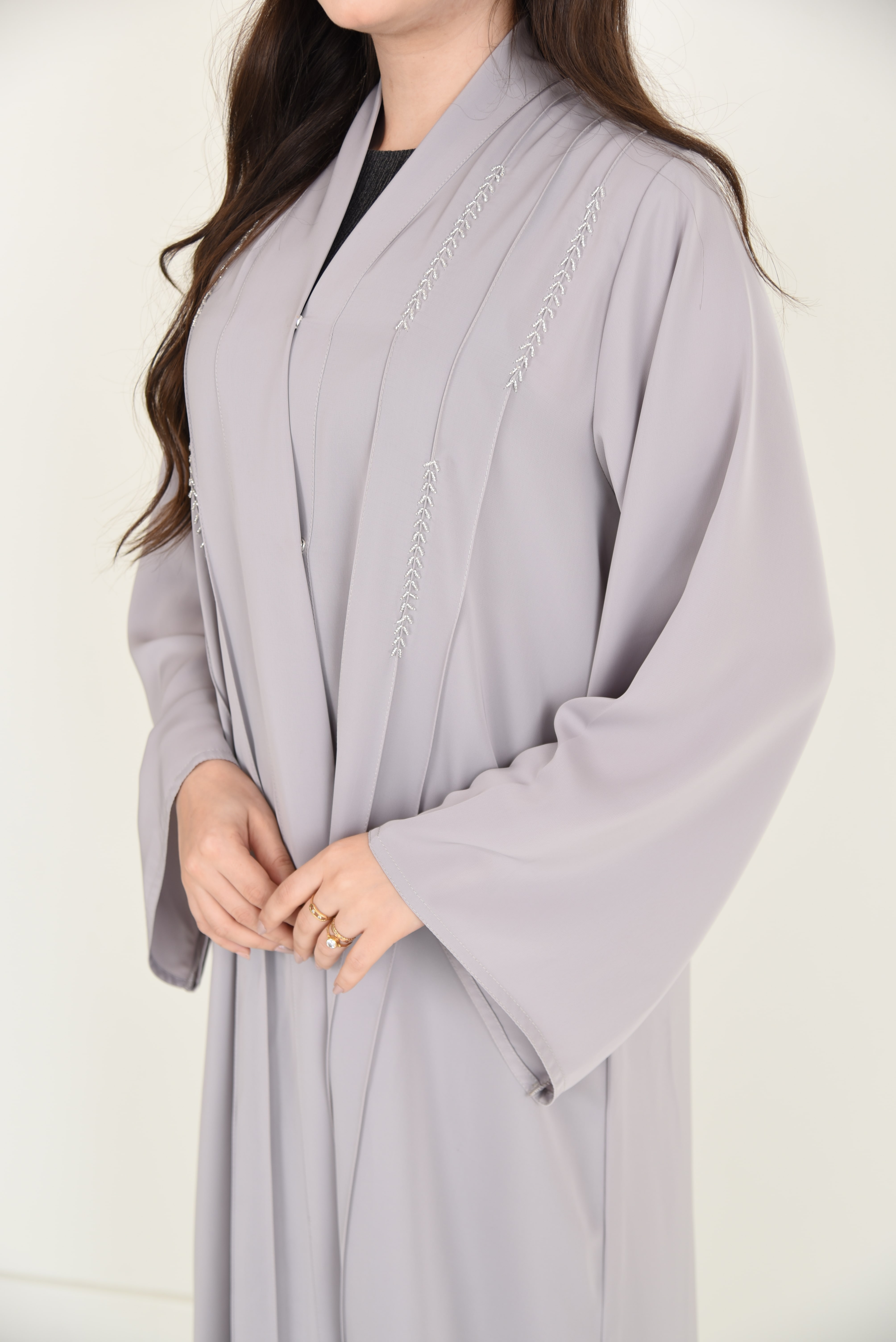 عباية بيج ناعمة بتطريز شك أنيق على الصدر والأكمام