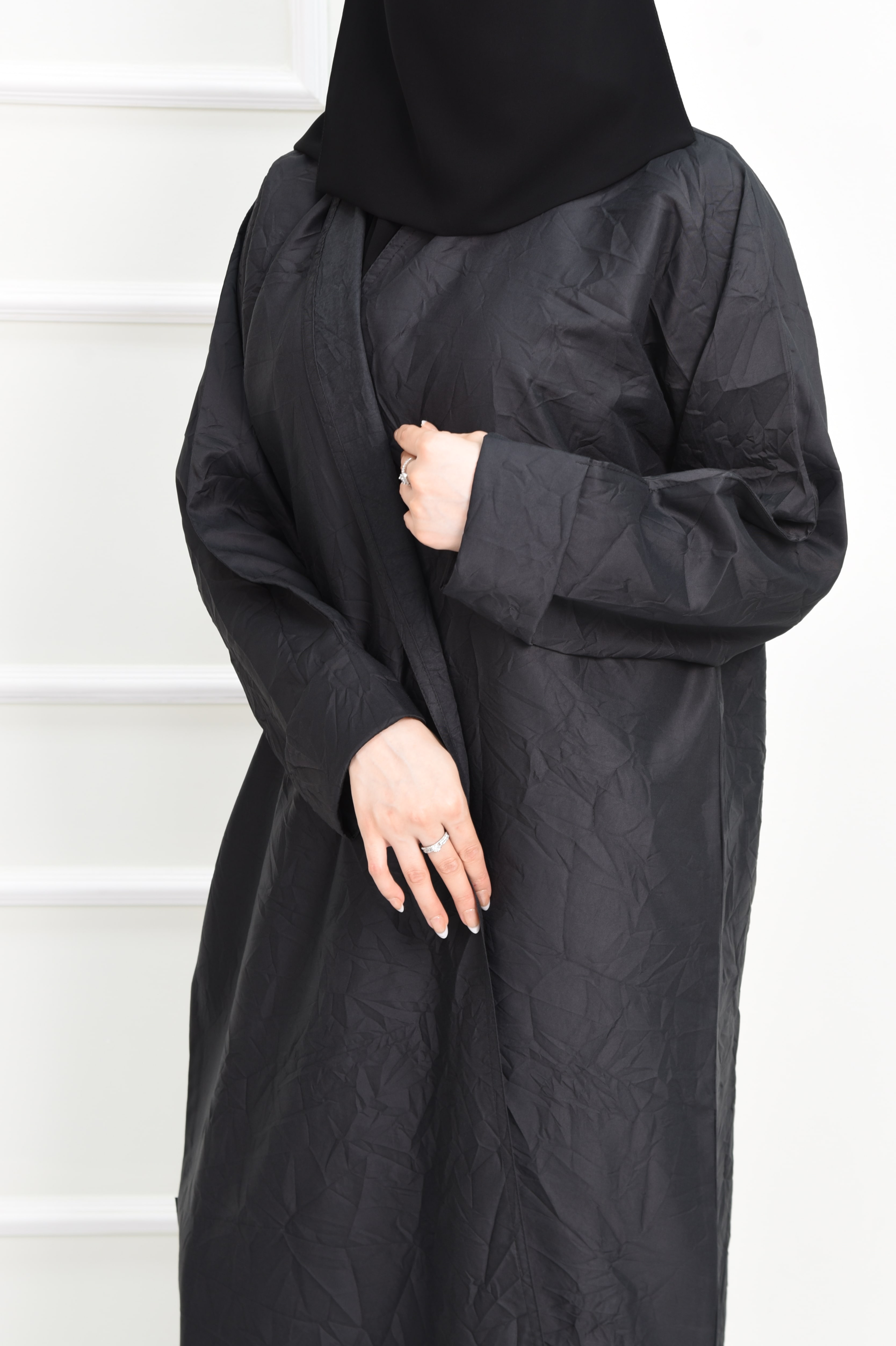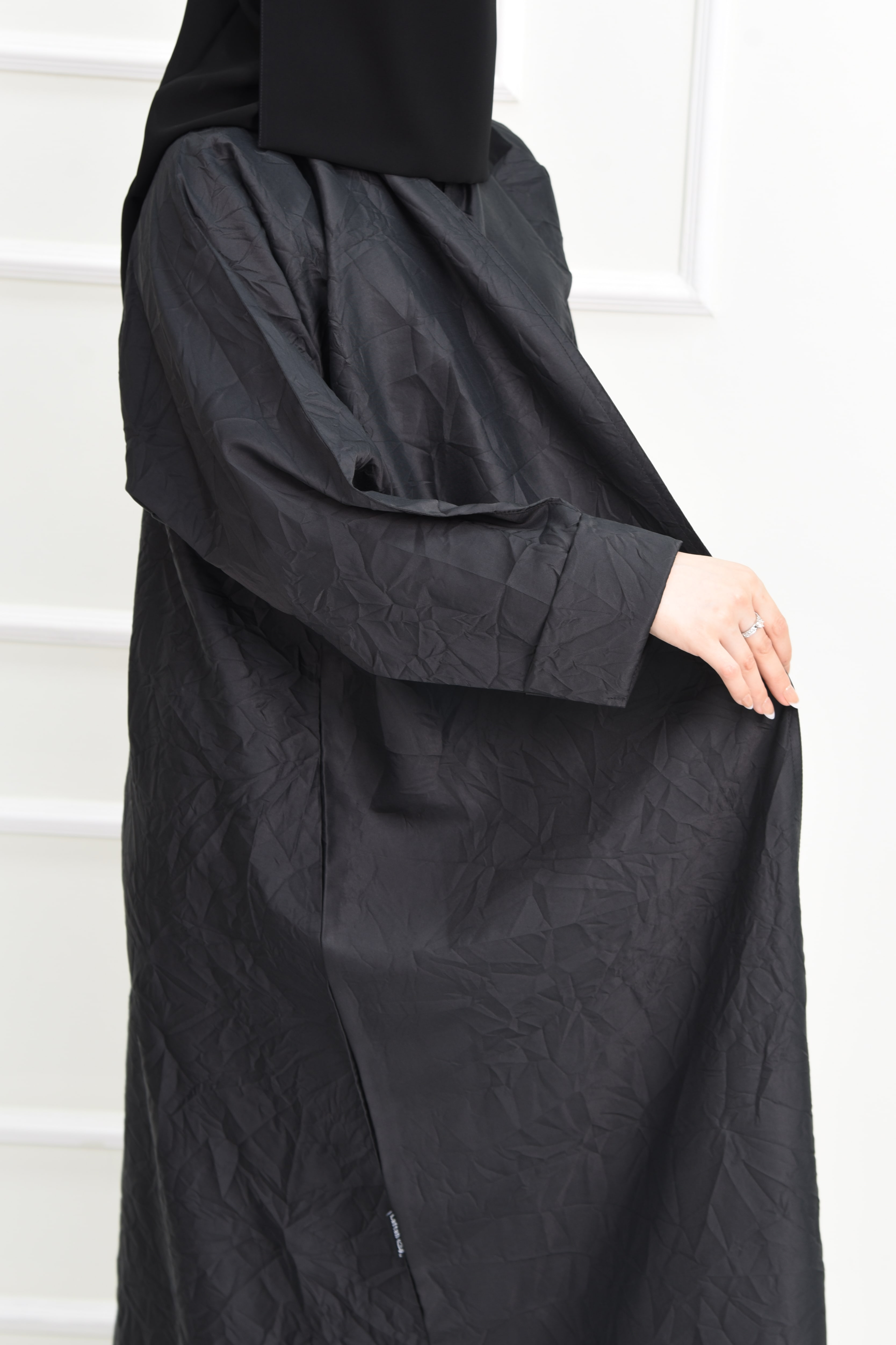 عباية مصممة من قماش تفتة مطفي فاخر بلون أسود فاحم يمنحك حضوراً أنيقاً وراقيًا في كل مناسبة.