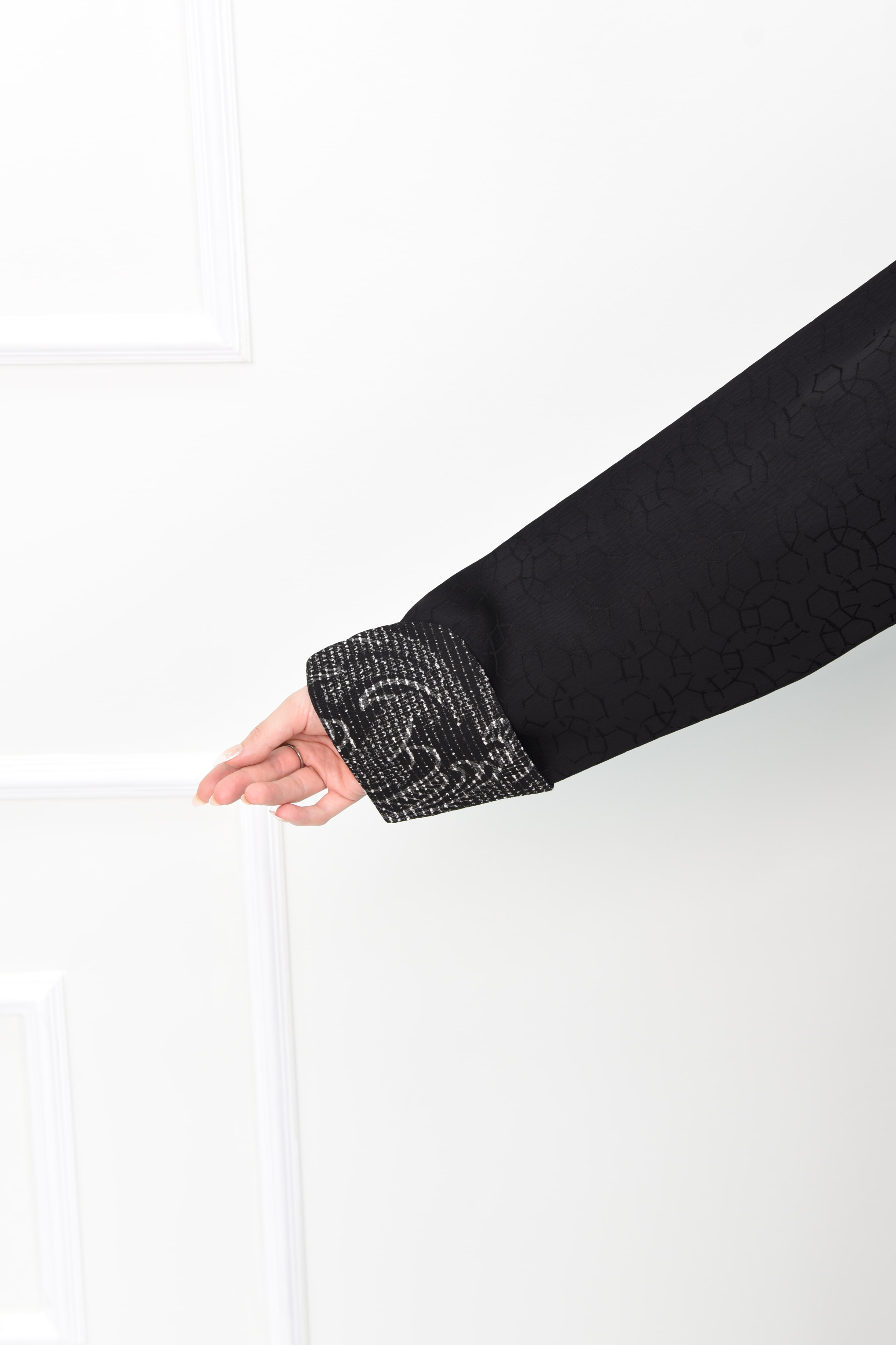 وصف العباية: عباية مصممة من قماش الجاكار الفاخر، تتميز بياقة "كول ريفير" أنيقة وأكمام مقلوبة مقلمة بالبيج. تصميم فريد يجمع بين الراحة والأناقة.