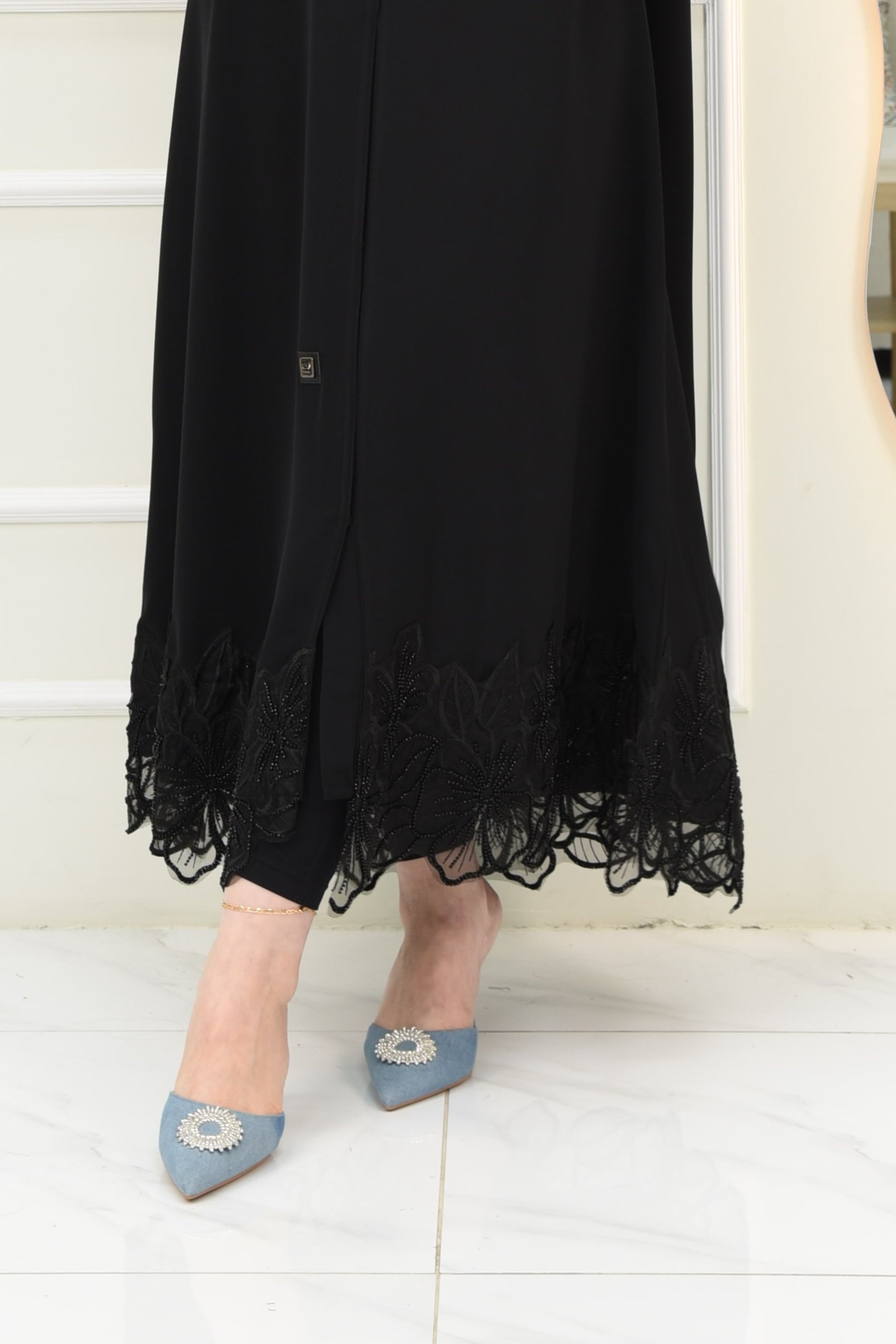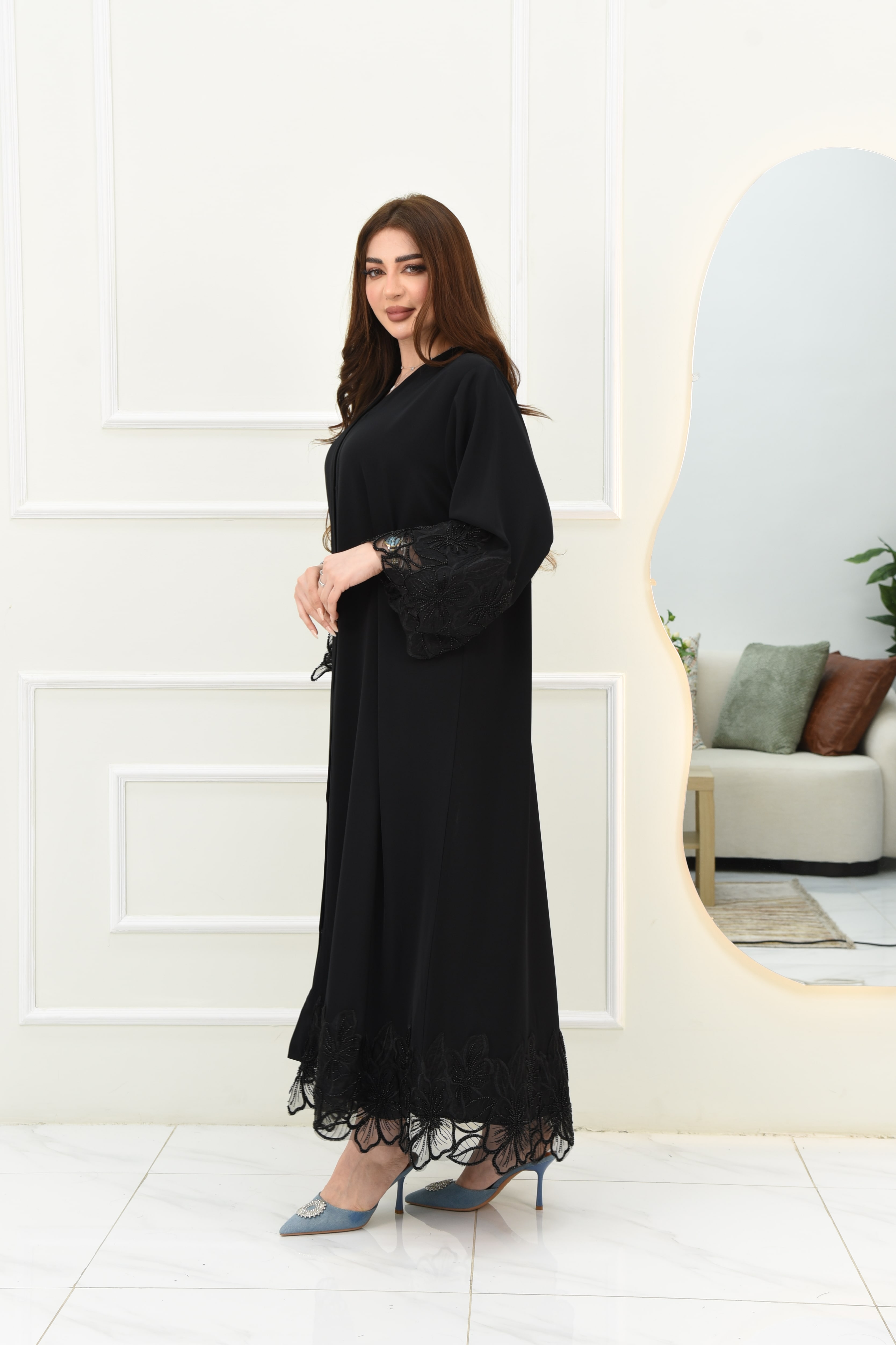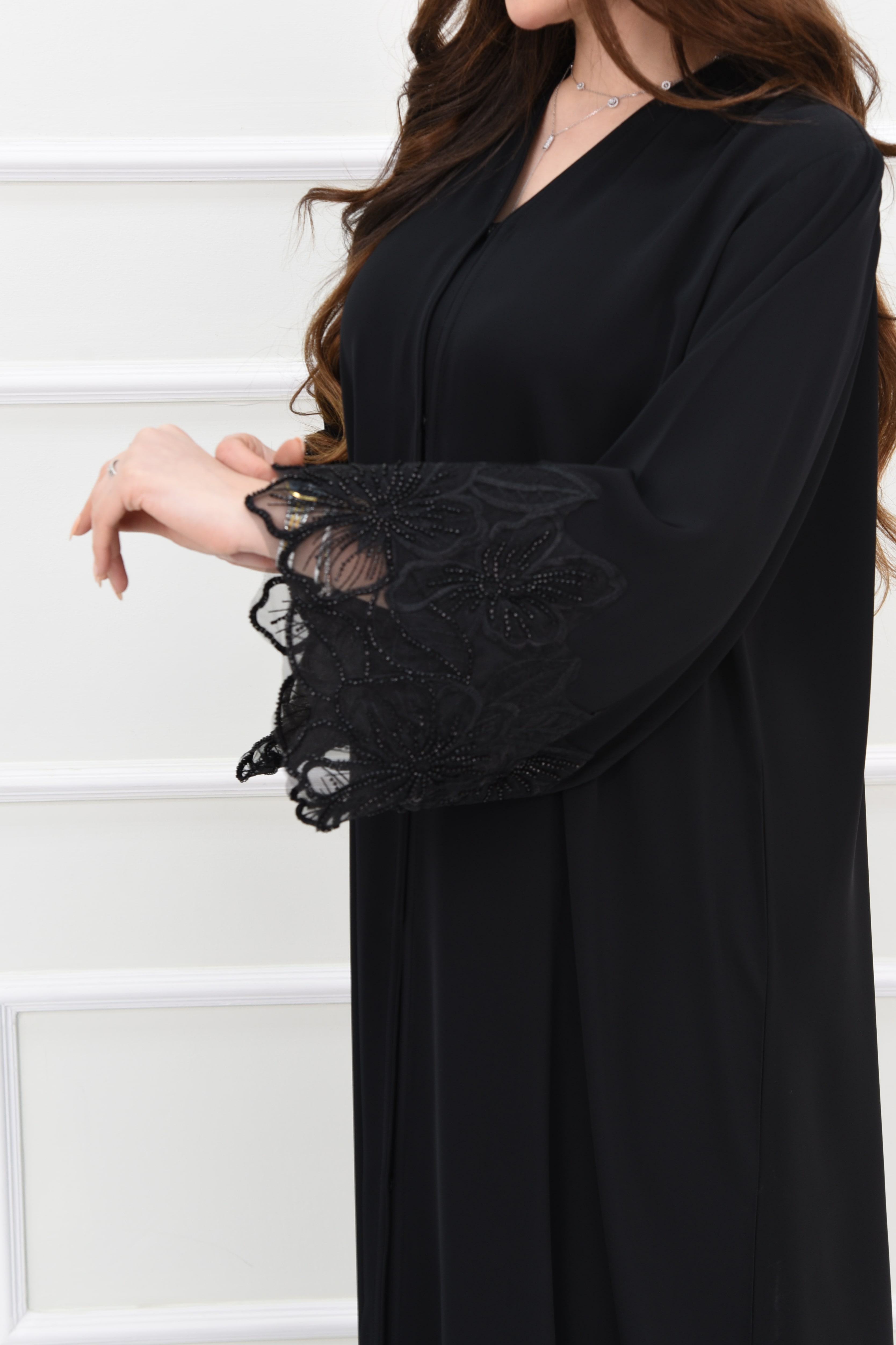 وصف العباية: عباية ناعمة من قماش فاخر، مزينة بدانتيل مطرز بتطريز خرزي على الحواف السفلية وعلى الأكمام. تصميمها الراقي والفخم يجعلها مثالية للمناسبات الخاصة حيث تضيف لمسة من الأناقة والفخامة.