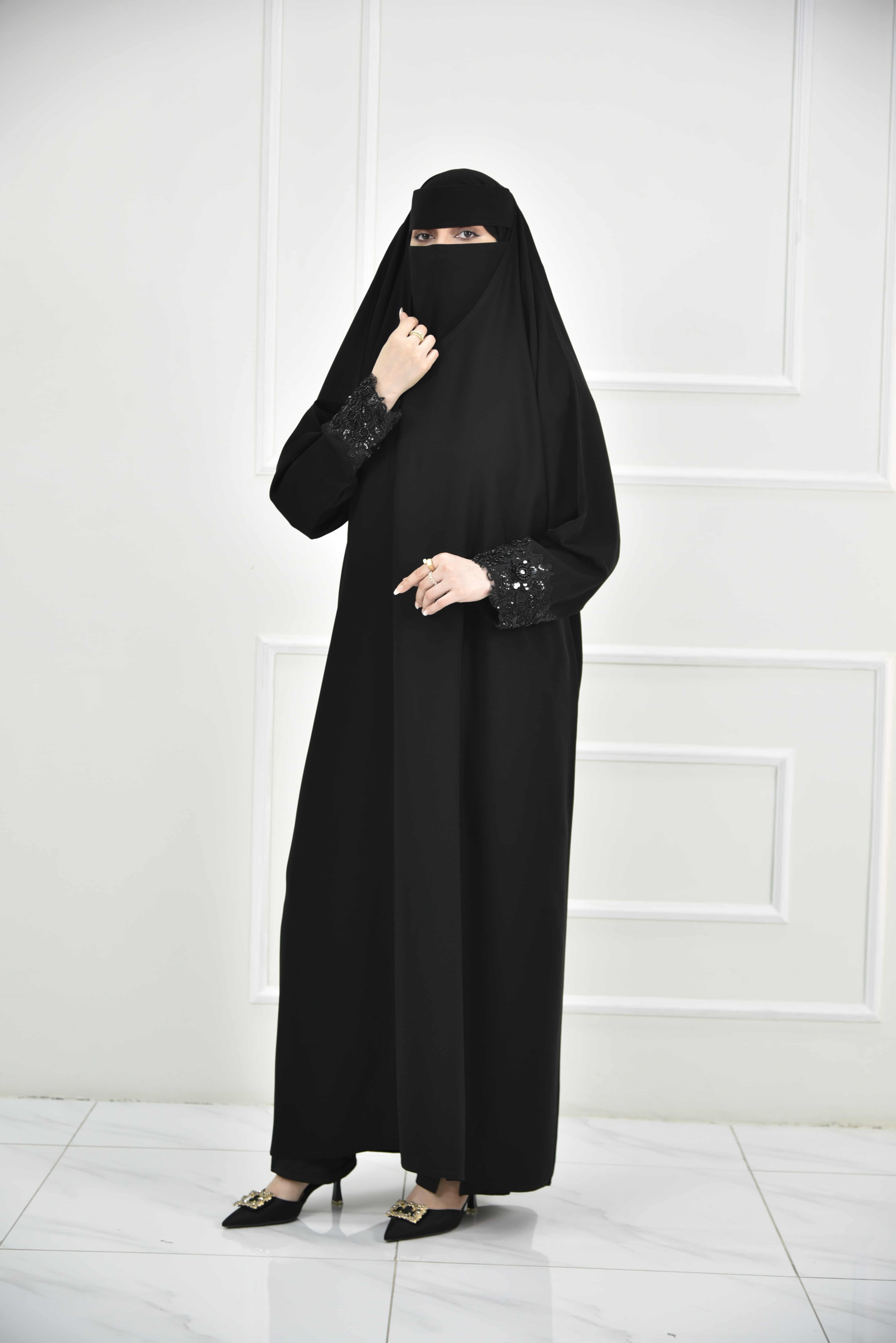 تصميم رأس يوفر تغطية للرأس بدون الحاجة لطرحة، بقصة عادية وانسيابية. الأكمام تأتي بقصة عادية مع كلف مطرزة، والقفلة مغلقة لتعزيز الستر.