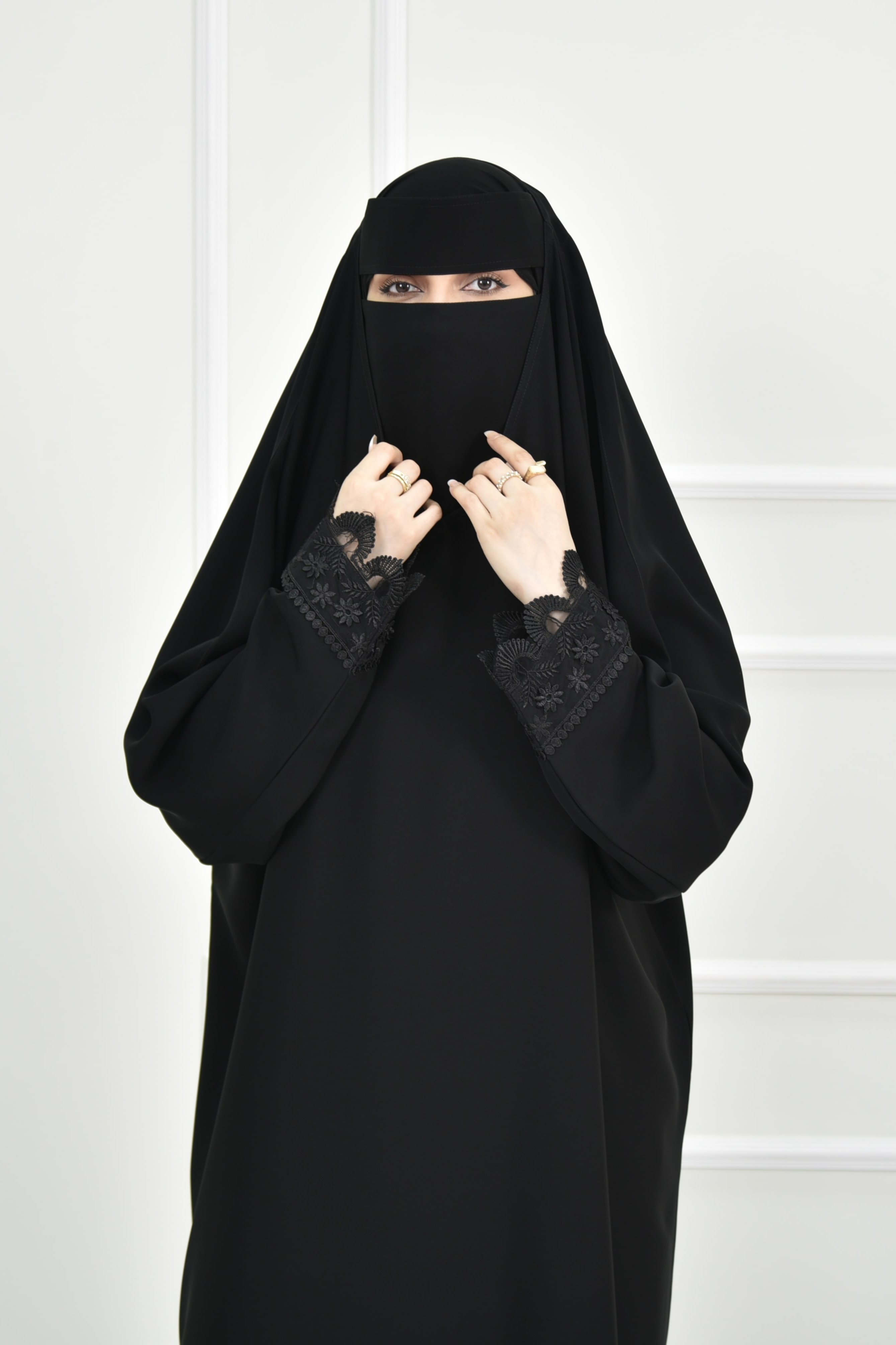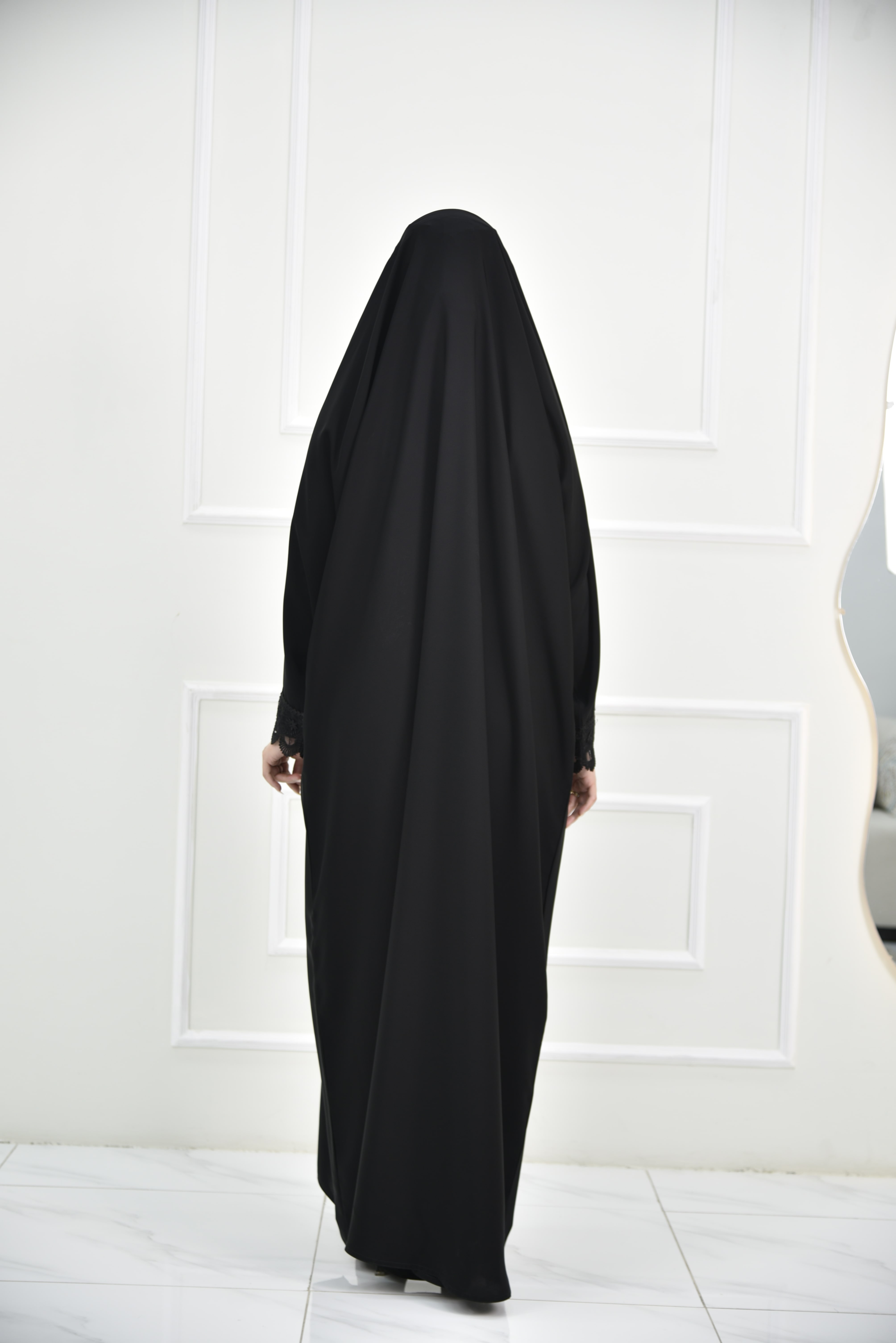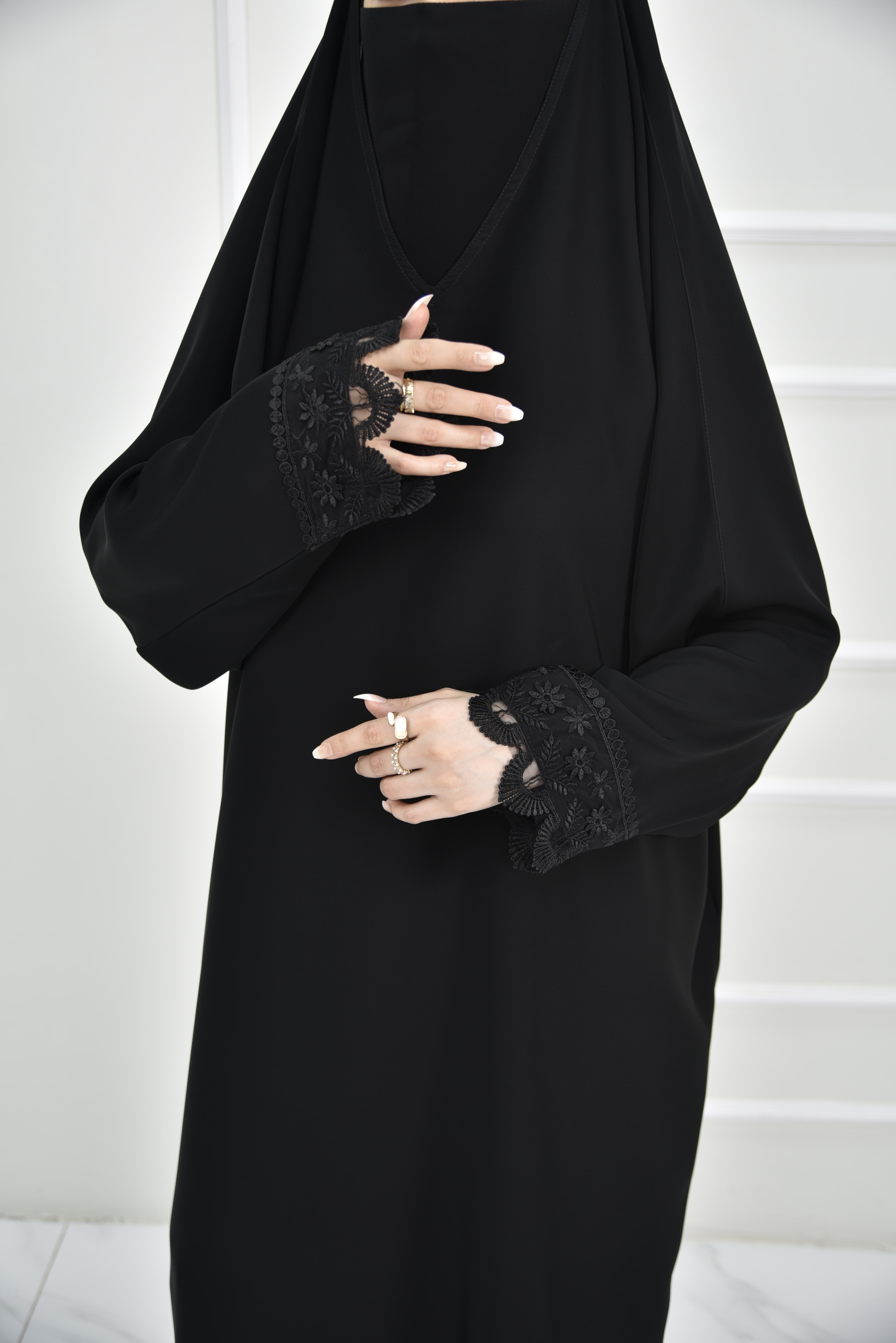 تصميم رأس يوفر تغطية للرأس بدون الحاجة لطرحة، بقصة عادية وانسيابية. الأكمام تأتي بقصة عادية مع دانتيل على الحواف بتصميم مموج، والقفلة مغلقة لتعزيز الستر.