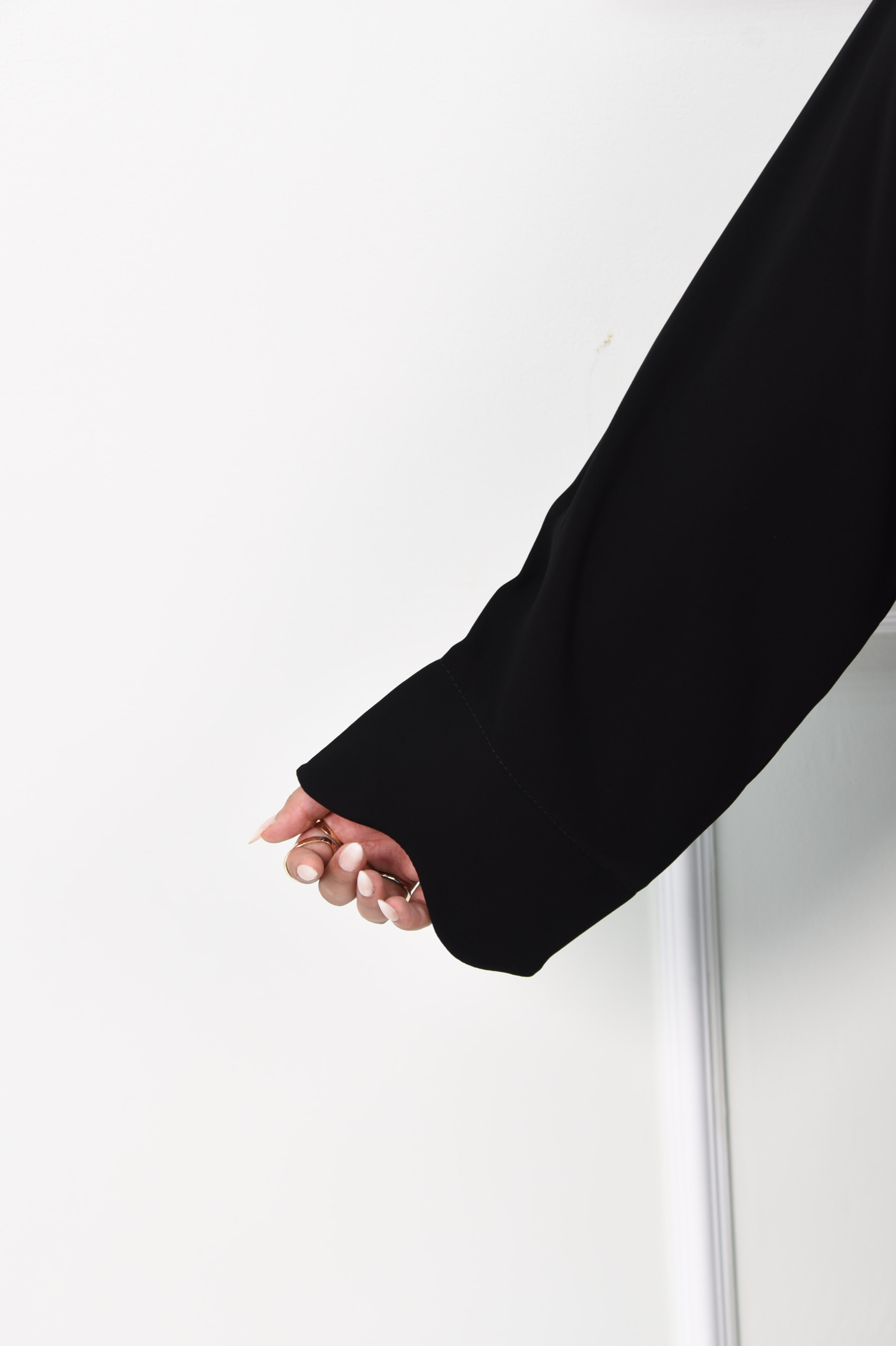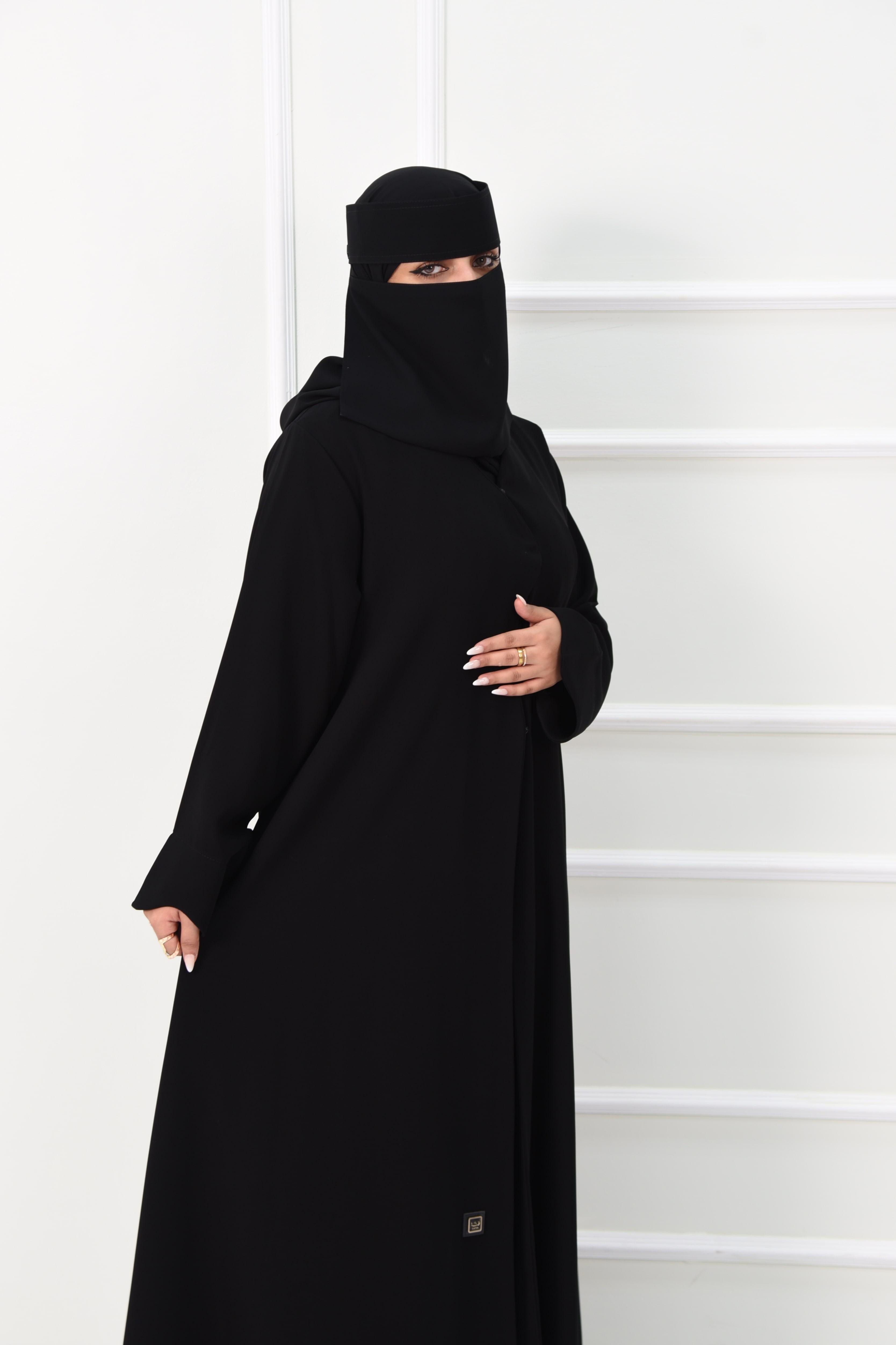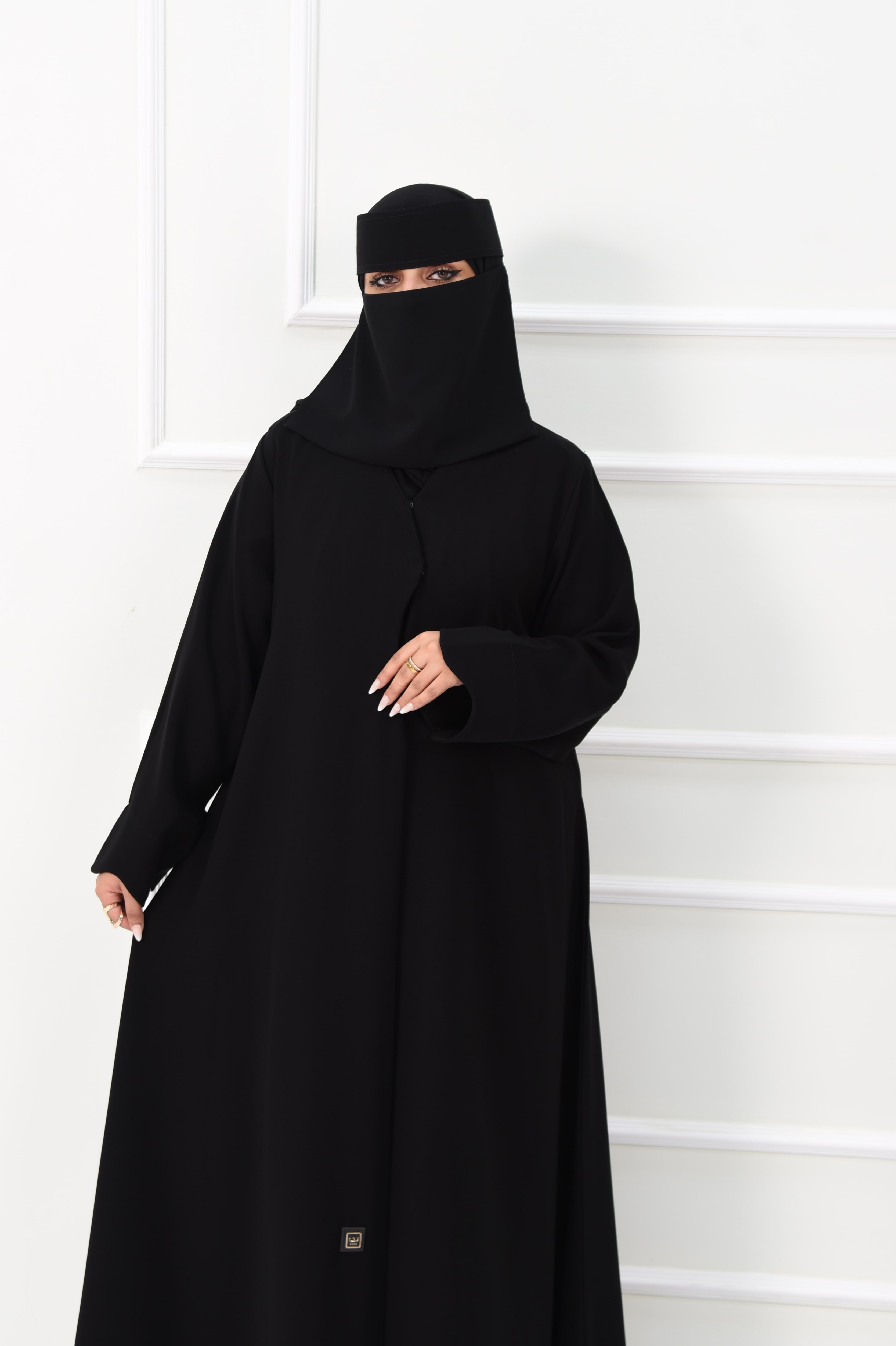 يُضفي الإغلاق المنحني عند الصدر والحواف المنحنية على الأكمام لمسة أنثوية أنيقة تجعل العباية مثالية للطلعات اليومية أو المناسبات الخاصة.