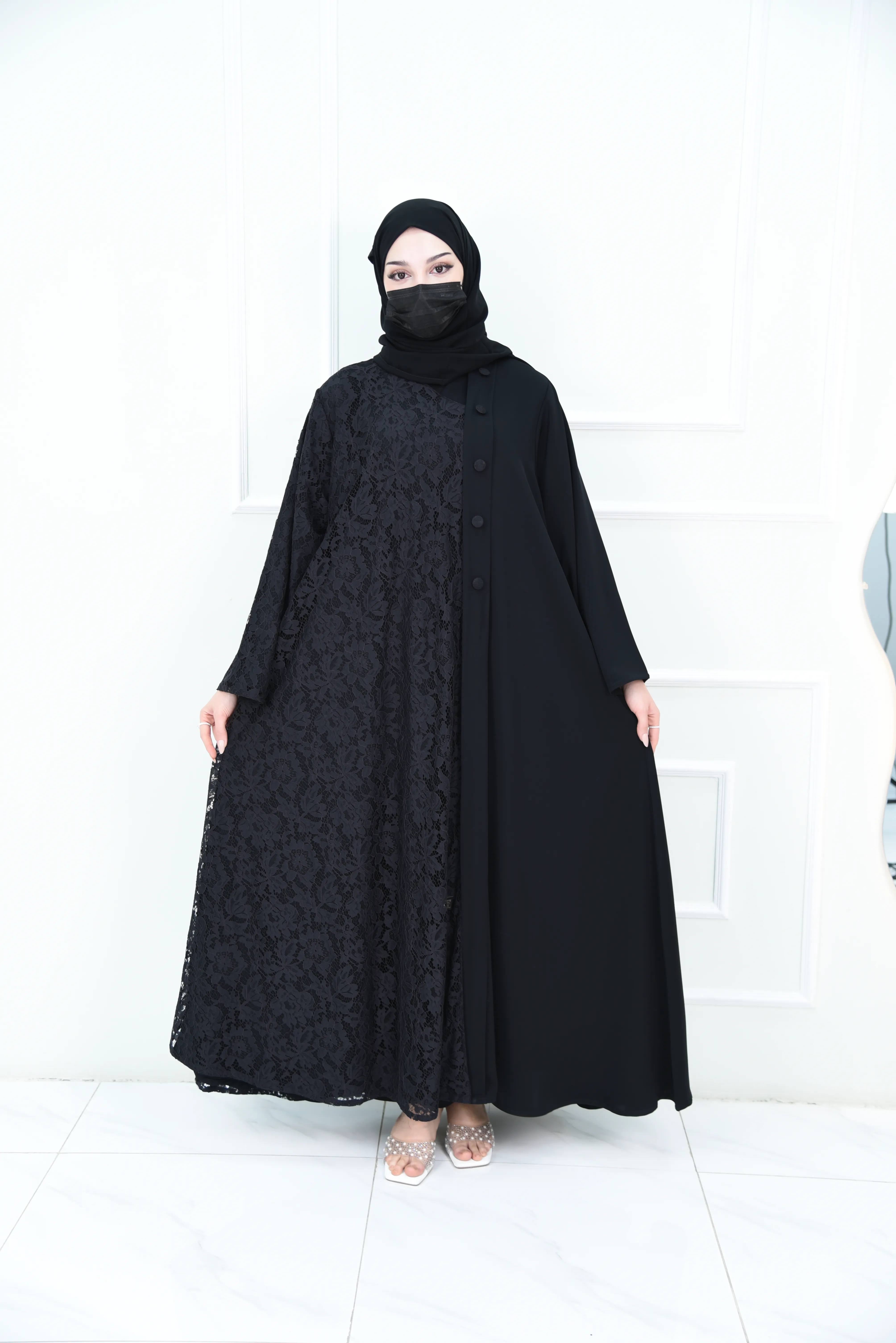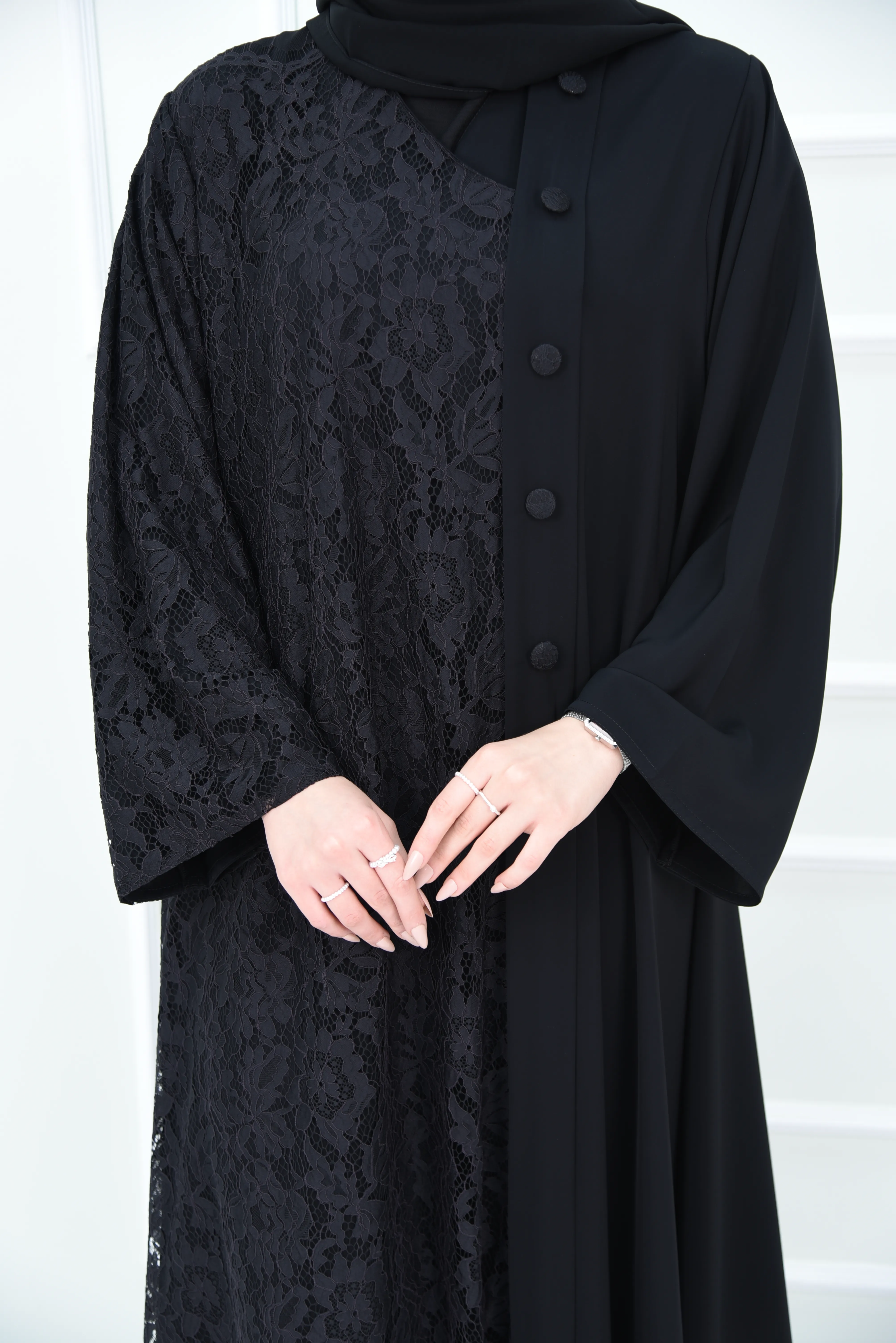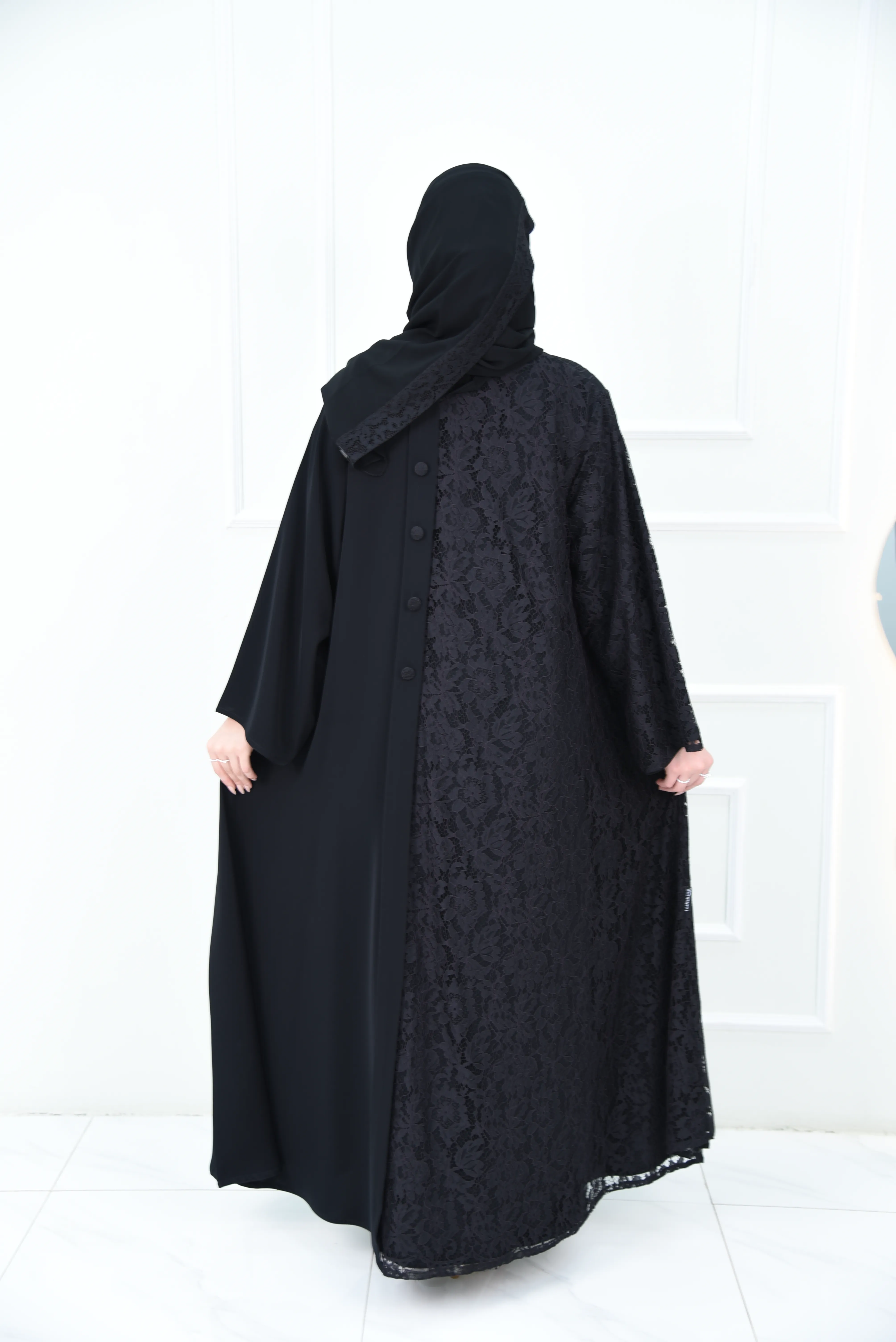 عباية سوداء مناسبات بتصميم نص دانتيل ونص سادة مع أزرار دانتيل.
