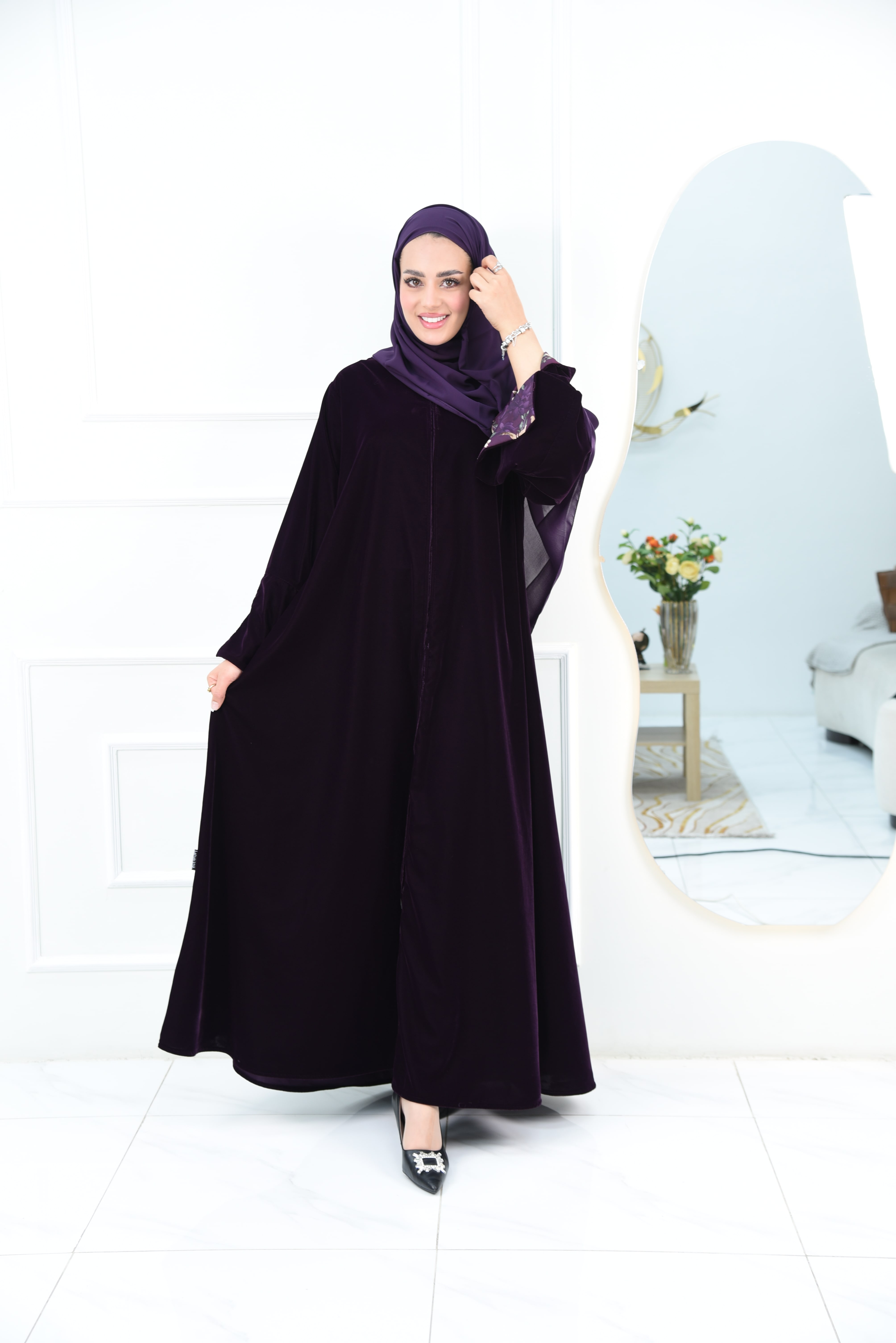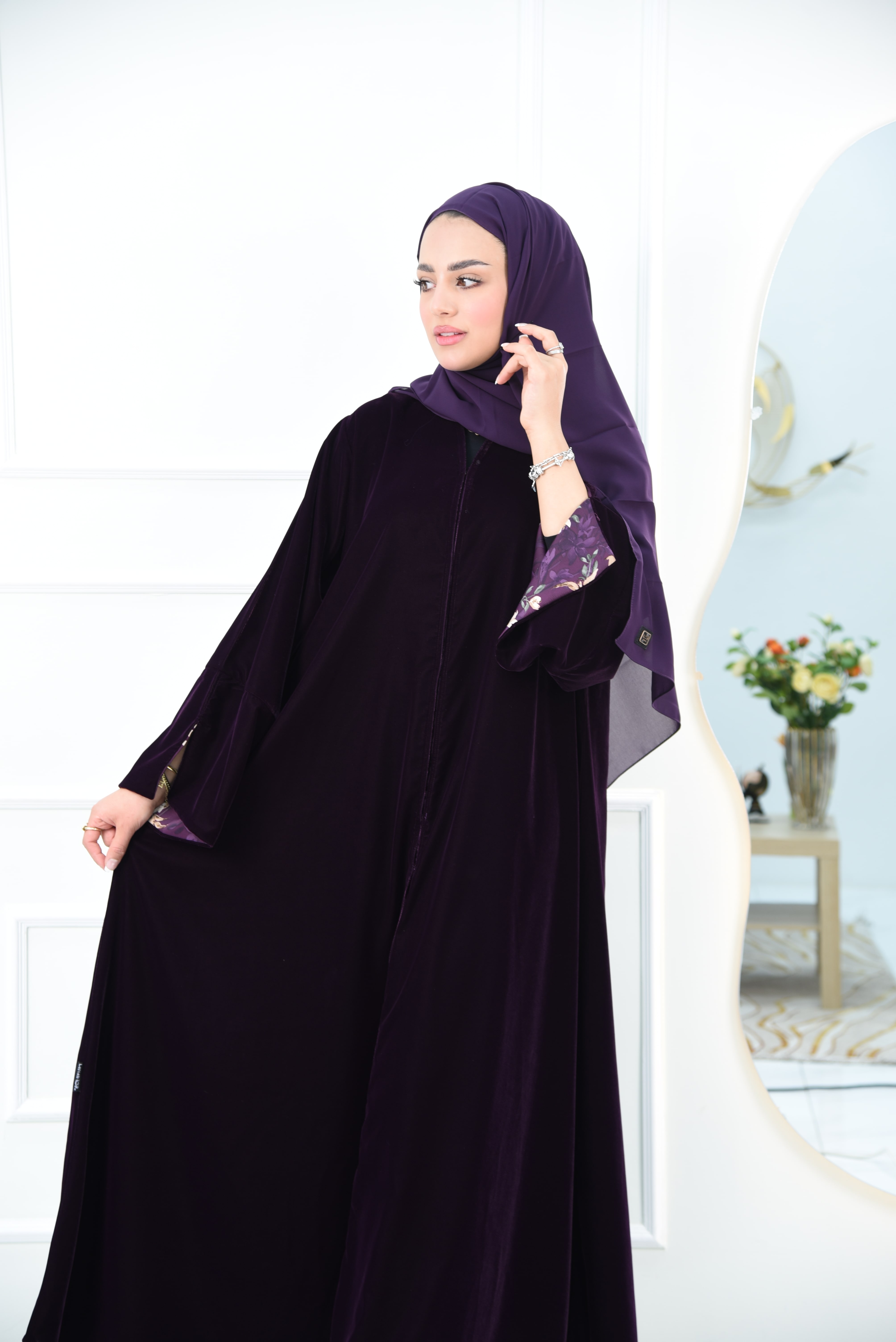 عباية شتوي مخمل بلون موف والكم مفتوح