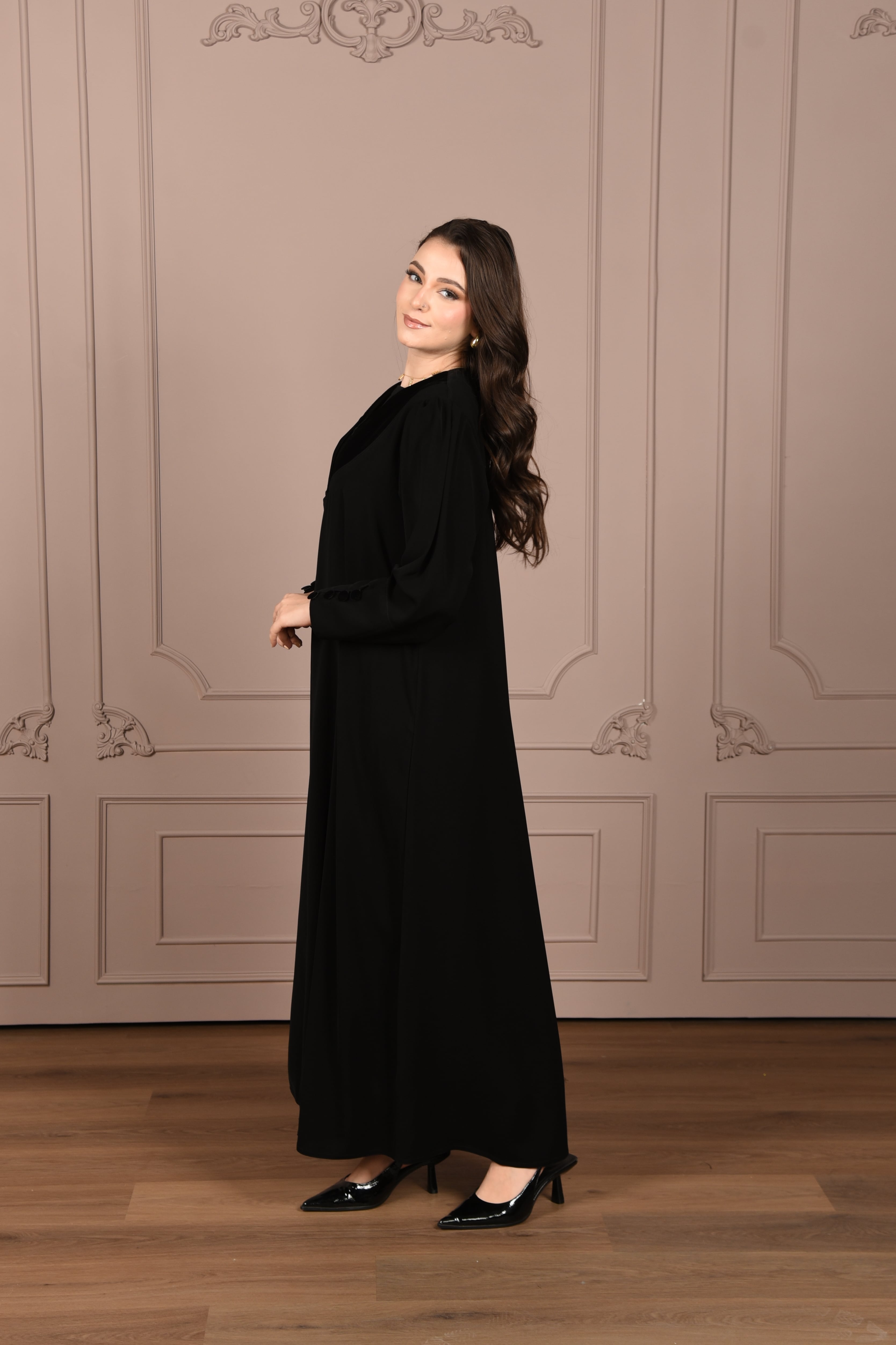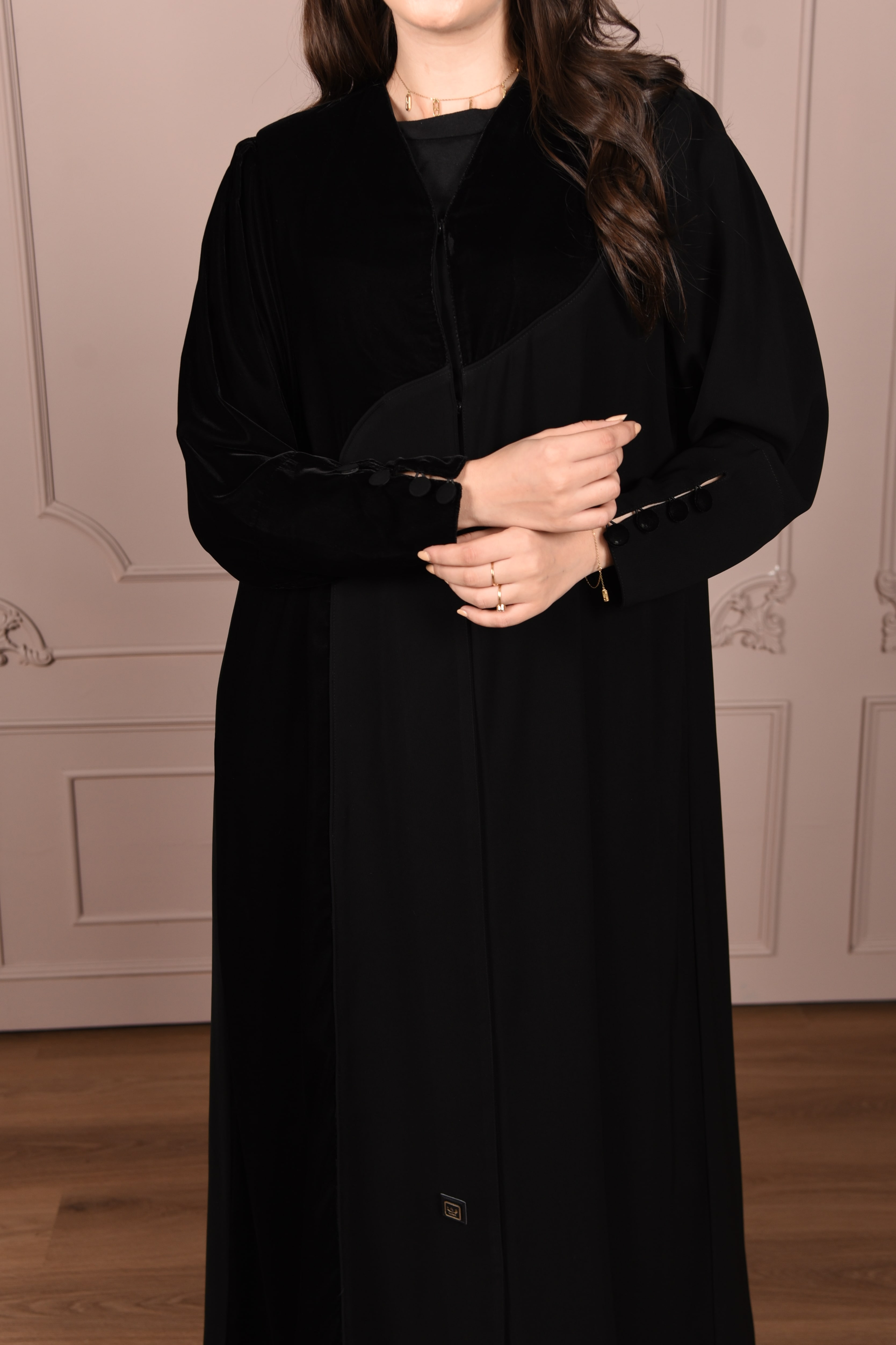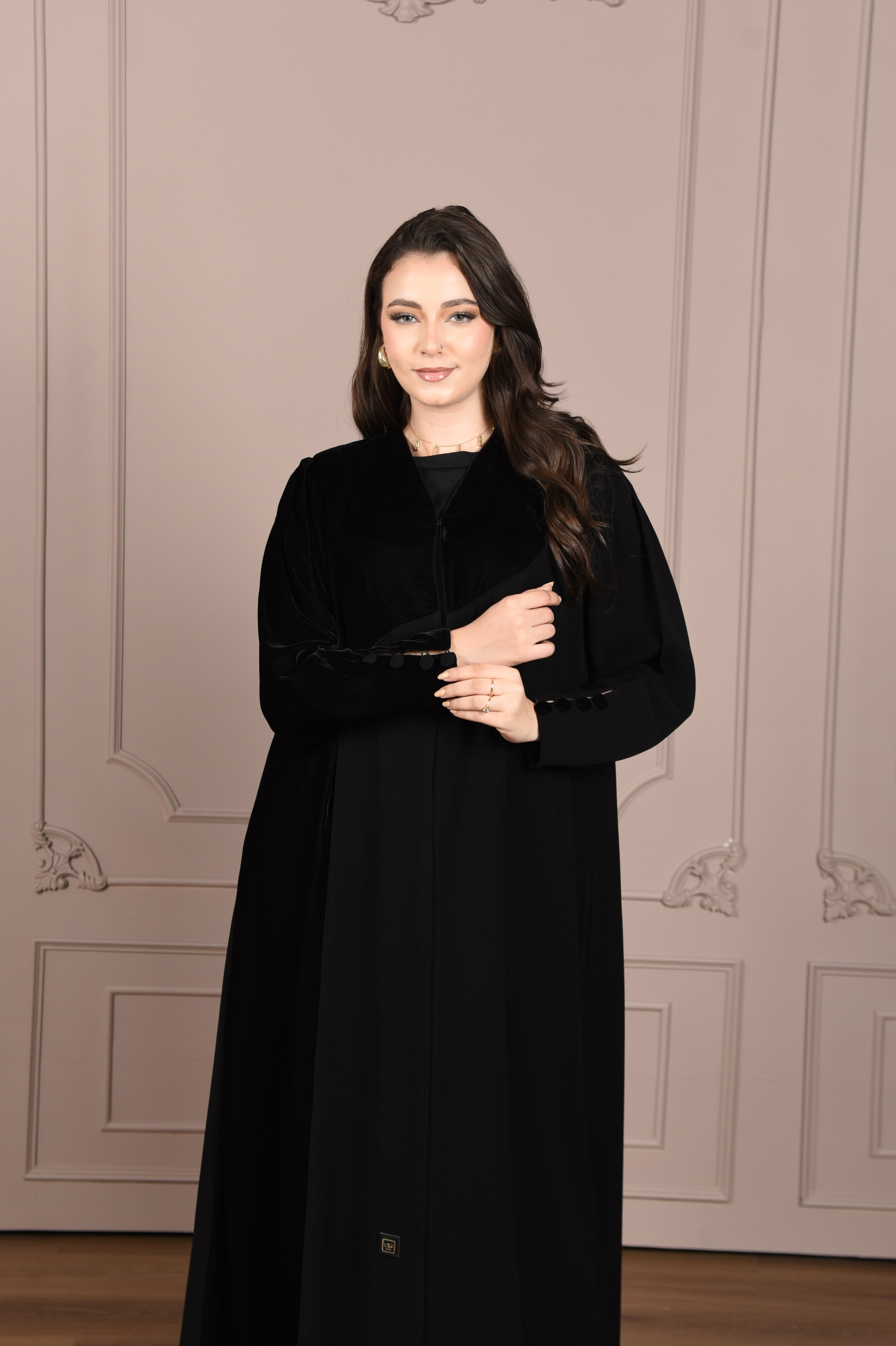 وصف العباية: عباية كاجوال فاخرة مصممة من قماش الكريب الناعم، مع لمسة مميزة من قماش المخمل على جهة واحدة، مما يضيف لها طابعاً عصريًا وأنيقًا. تتميز بأكمام مفتوحة تغلق بأزرار قماشية تضفي لمسة من الرقي والفخامة. هذه العباية ليست فقط أنيقة، بل أيضًا مناسبة لكل الفصول.