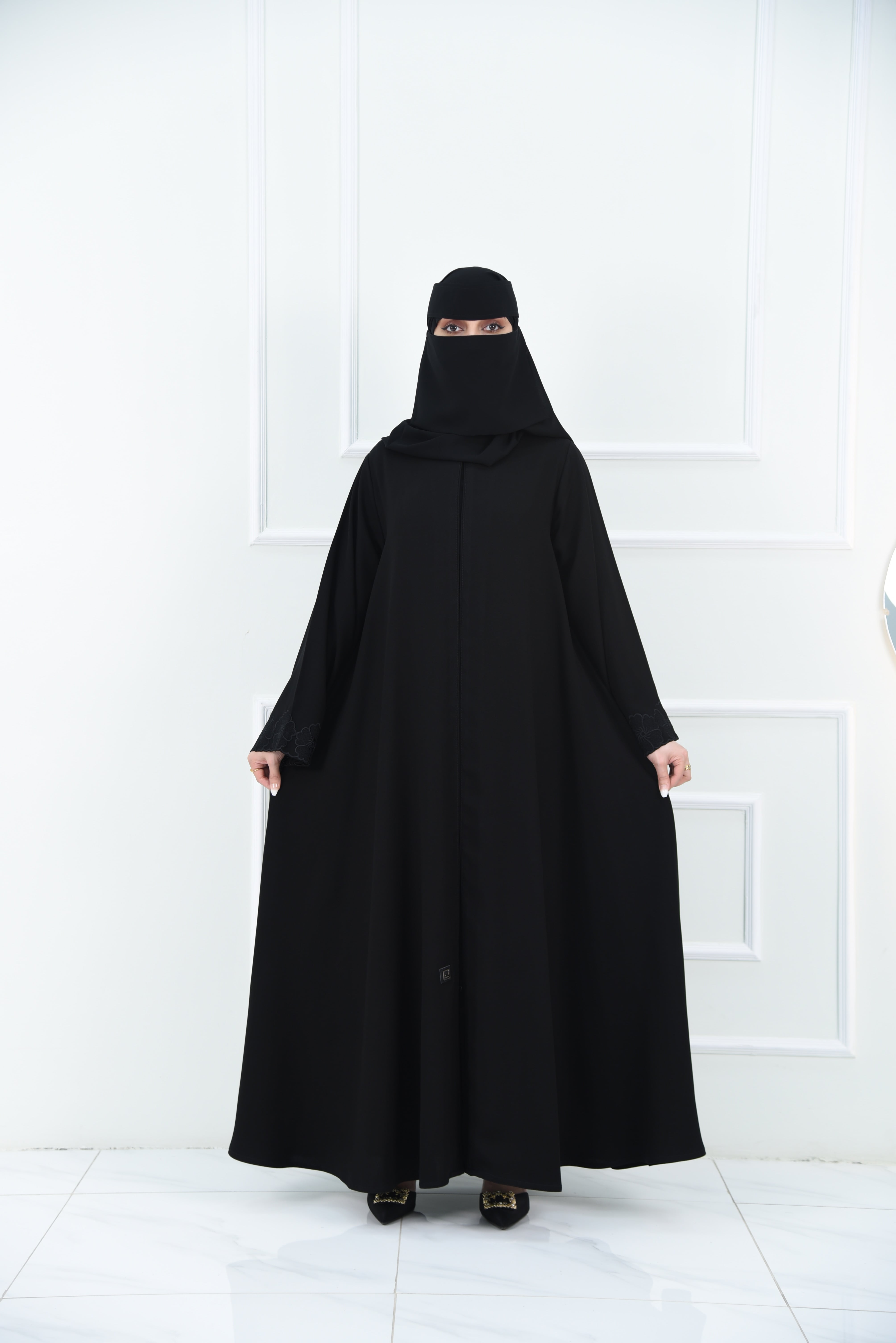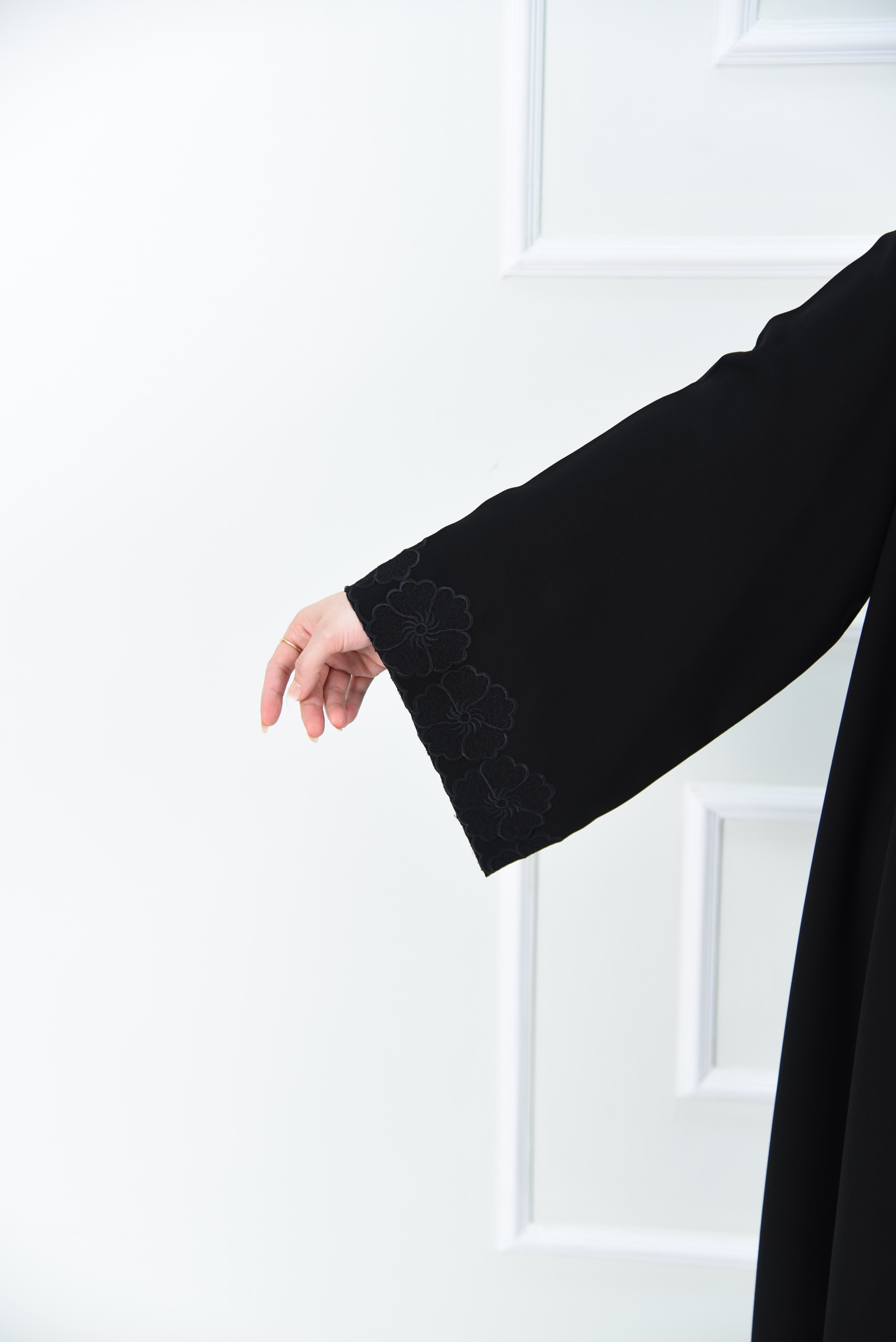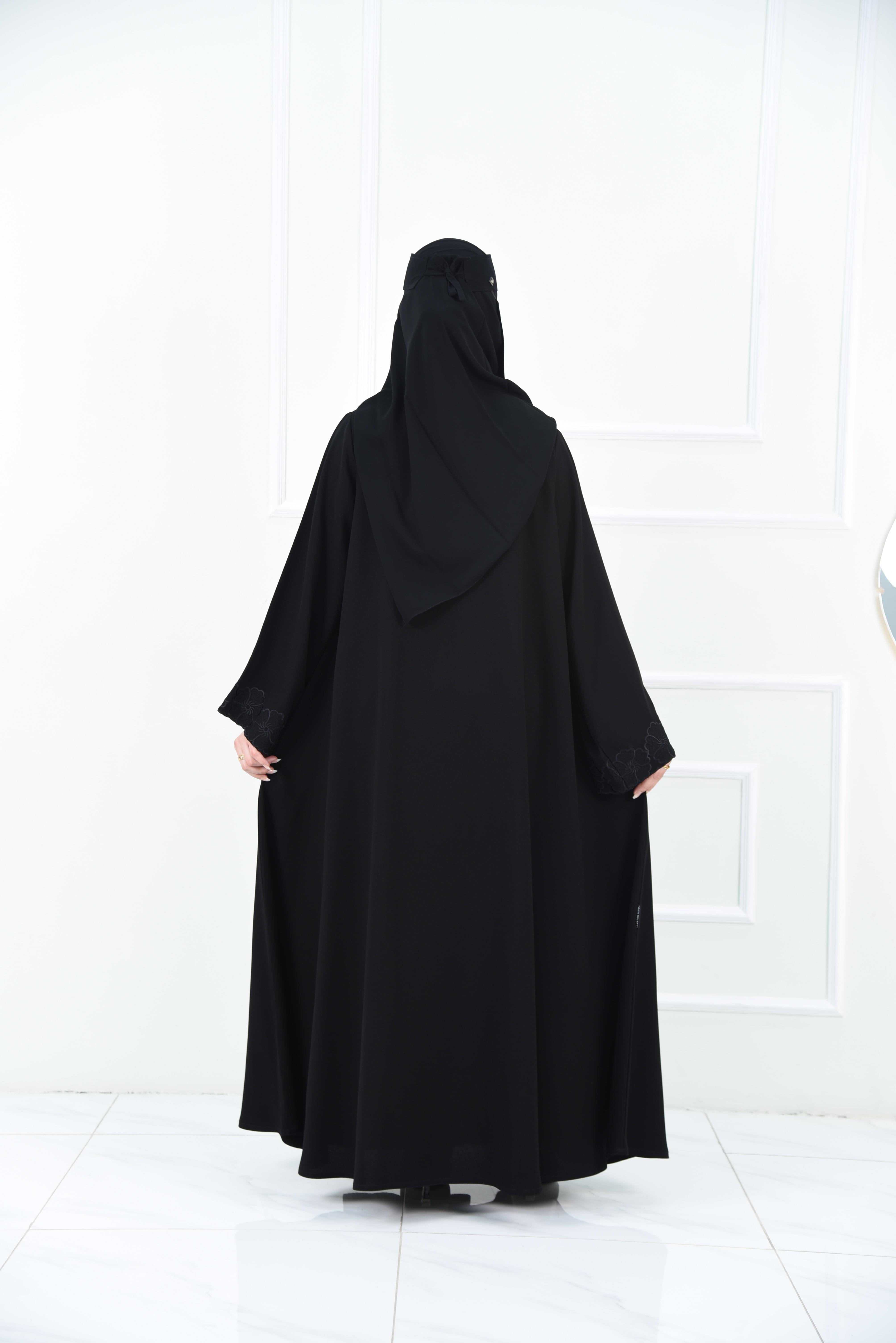 وصف العباية: عباية أنيقة من قماش الكريب الفاخر، تأتي بقصة كلوش تمنحكِ حرية الحركة وأناقة لامتناهية. تزين الأكمام تطريزات سوداء مميزة على شكل ورود، تضفي على العباية لمسة فاخرة وجمالية راقية.