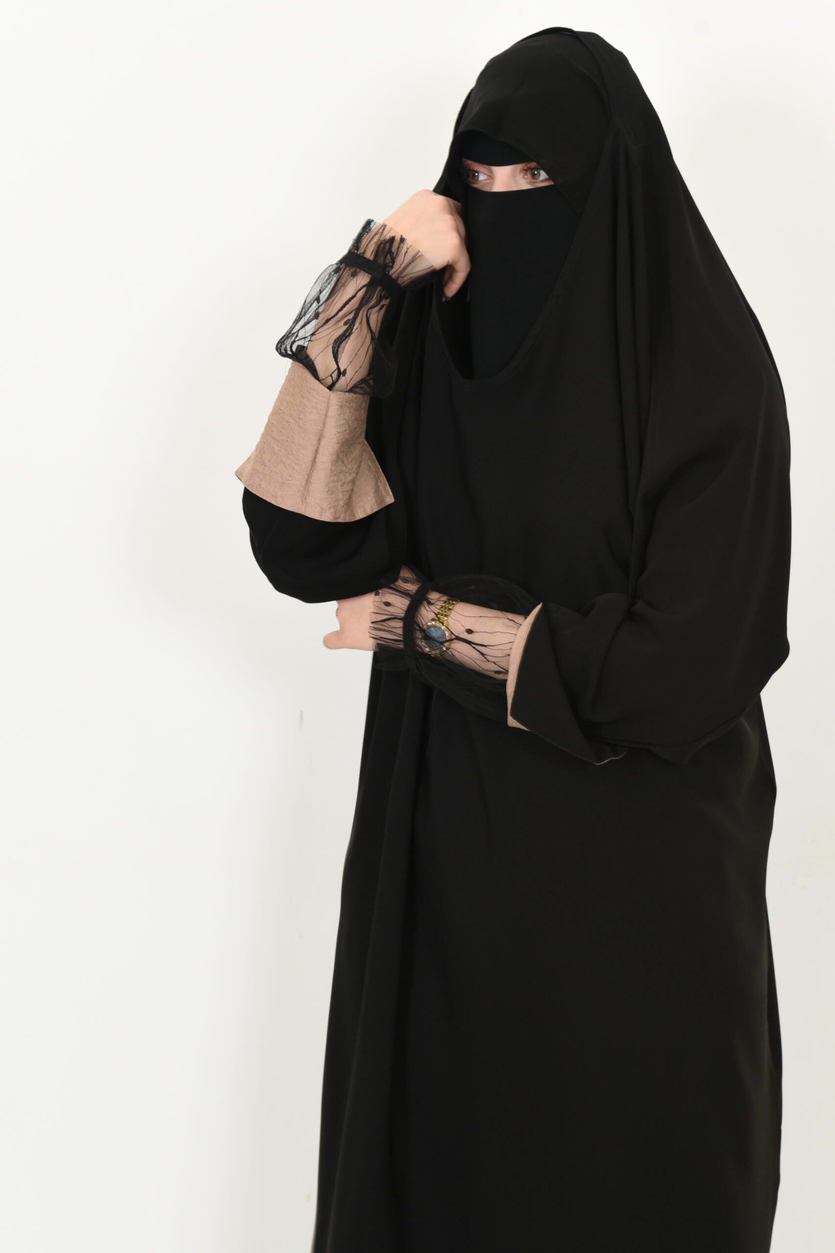 وصف العباية: عباية رأس سوداء مقفلة بالكامل، مصممة من قماش سرايا، العباية بأكمام قابلة للثني باللون البيج مع طبقة من الدانتيل.