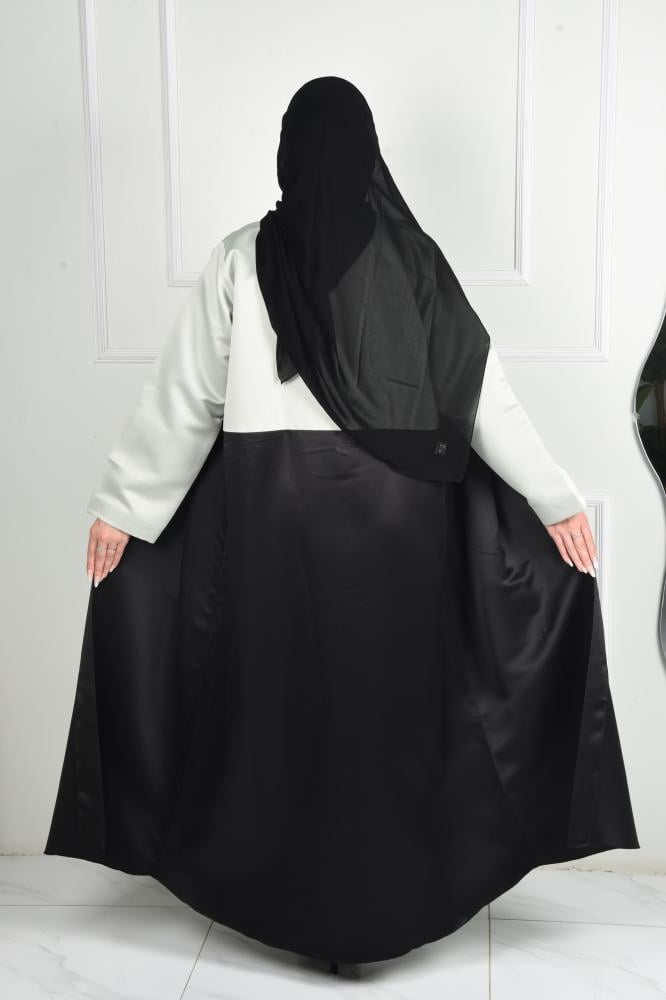 عباية مصممة من قماش كريب فاخر يجمع بين اللون الزيتوني الجذاب في النصف العلوي والأسود الكلاسيكي في النصف السفلي، لتمنحك مظهراً فخماً يعكس ذوقك الرفيع.