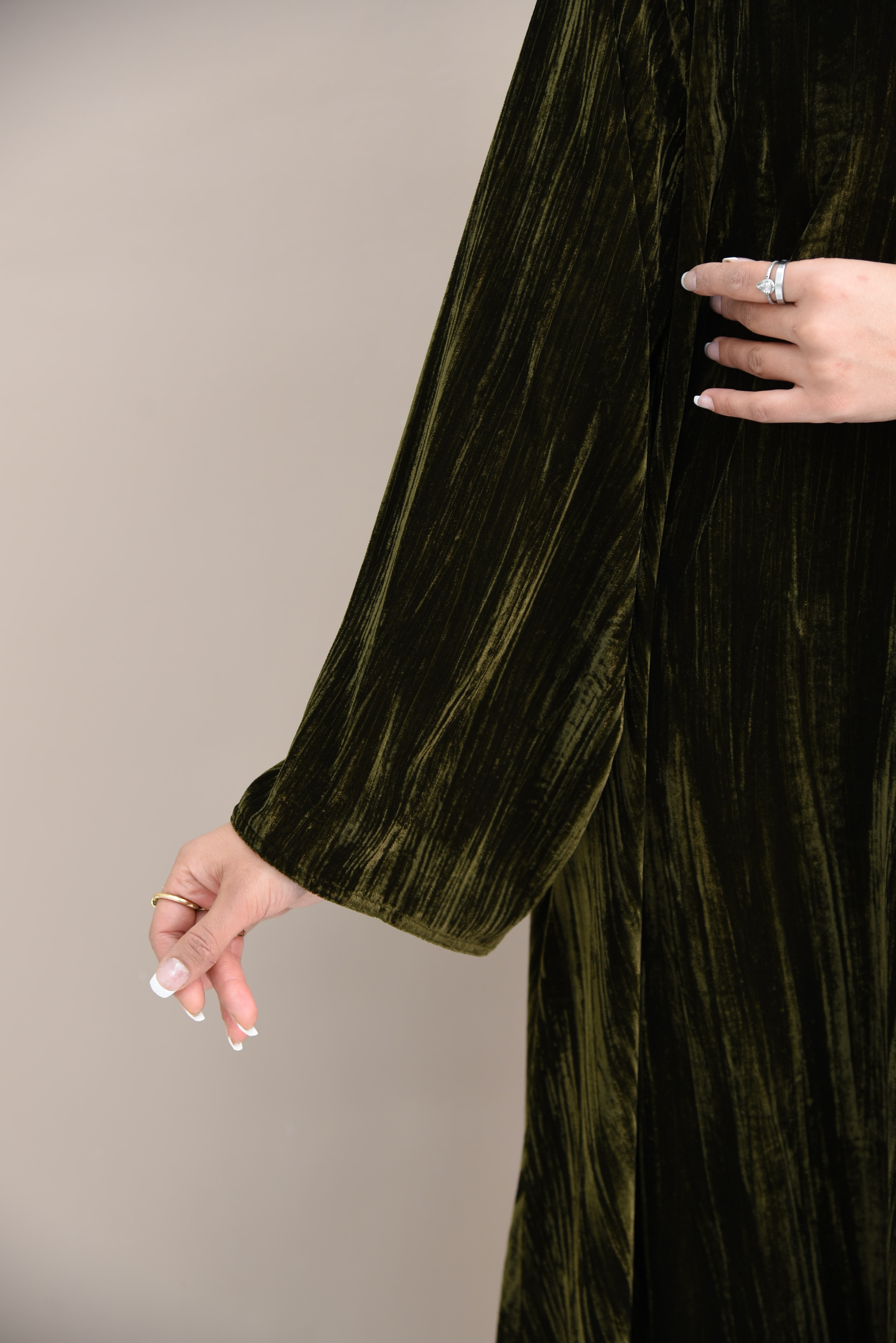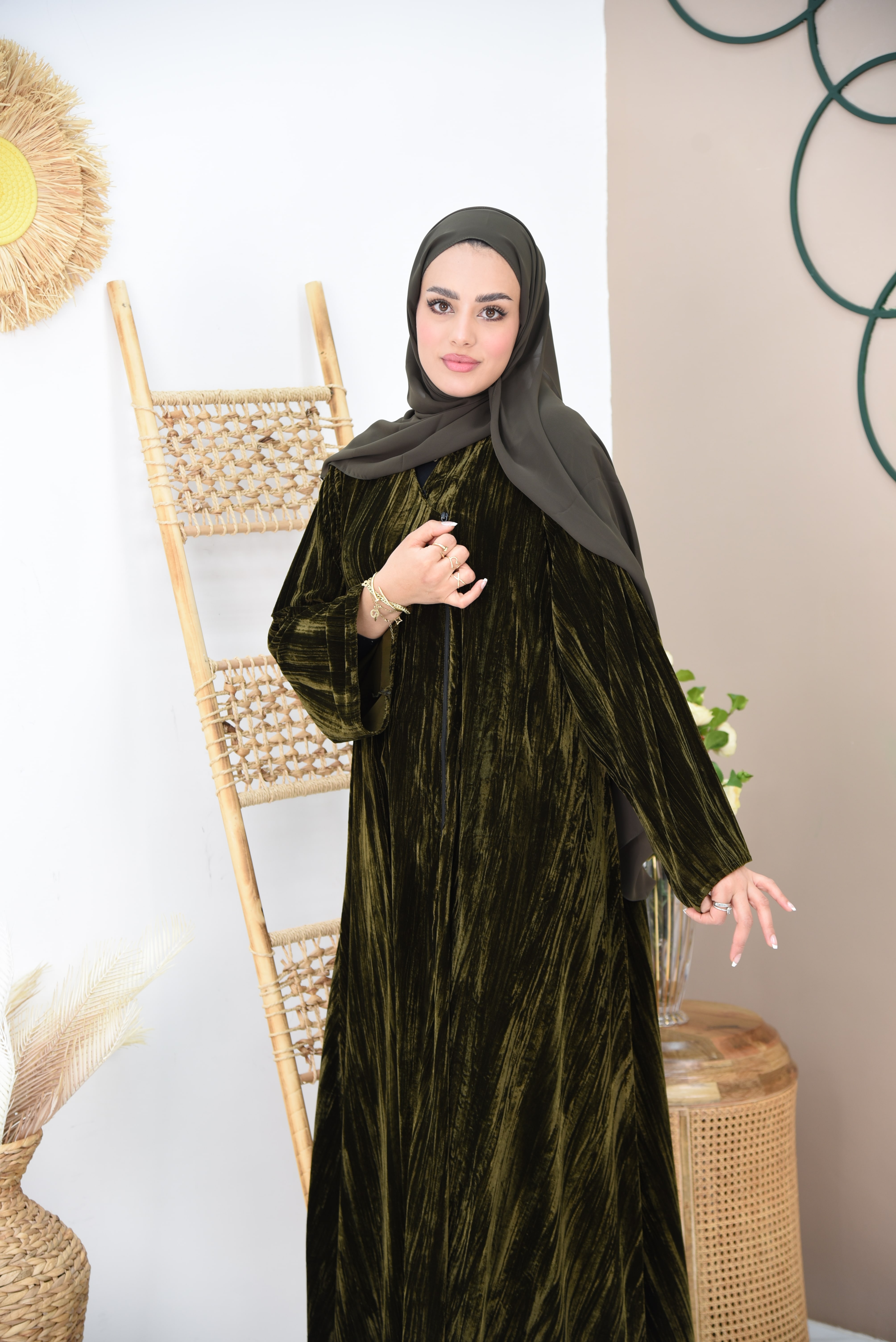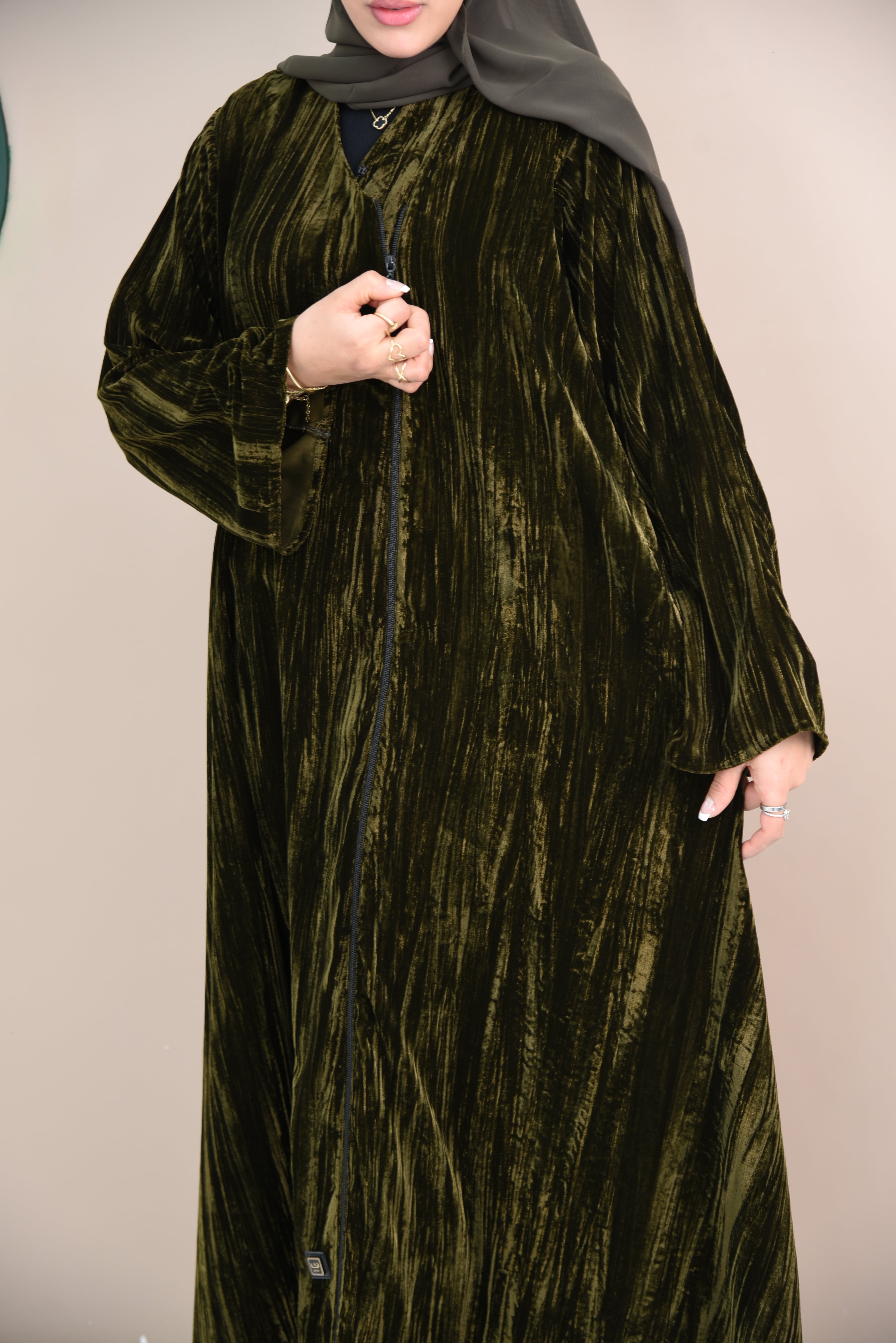 عباية مخمل ليزر مكسر بلون زيتي مع سحاب