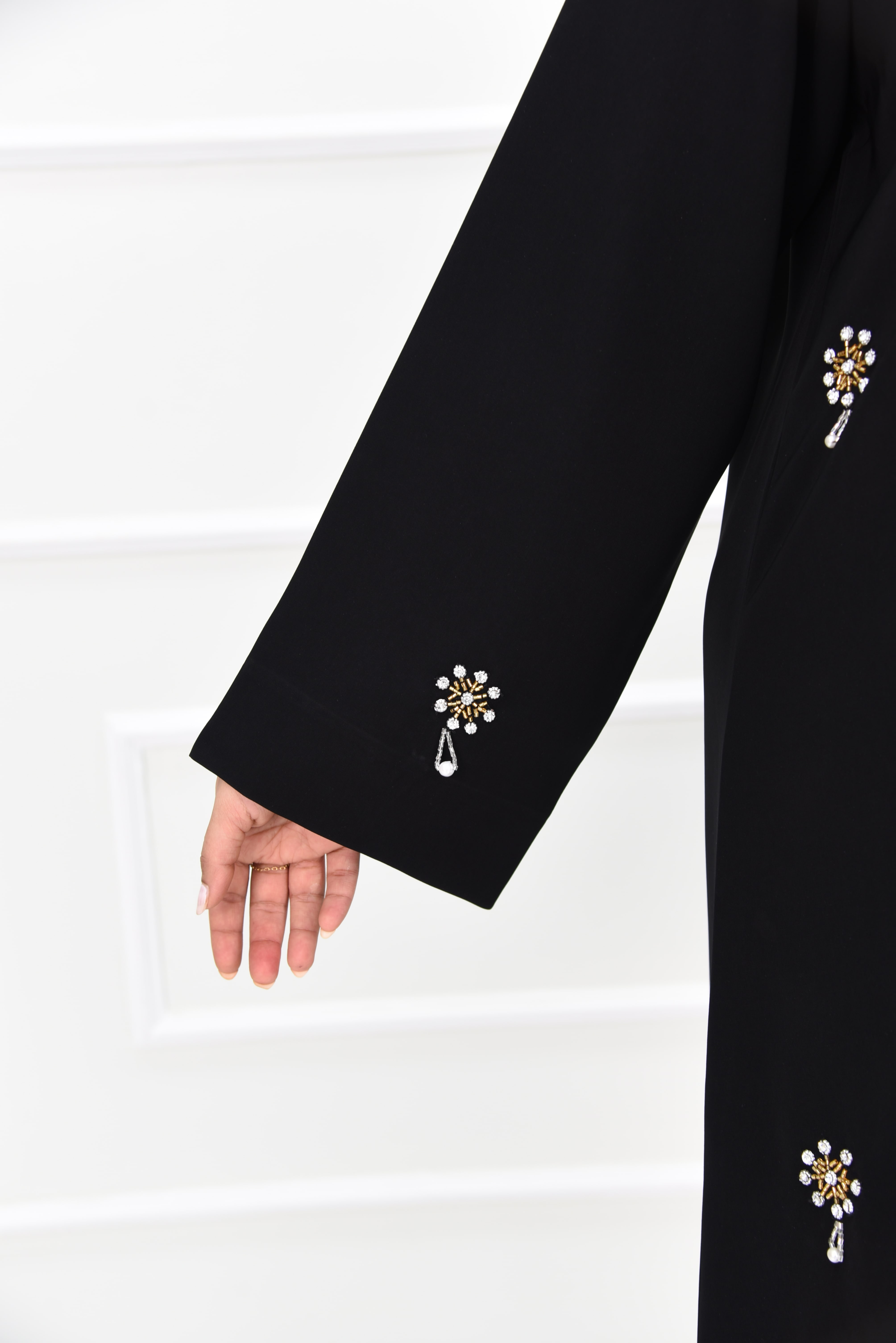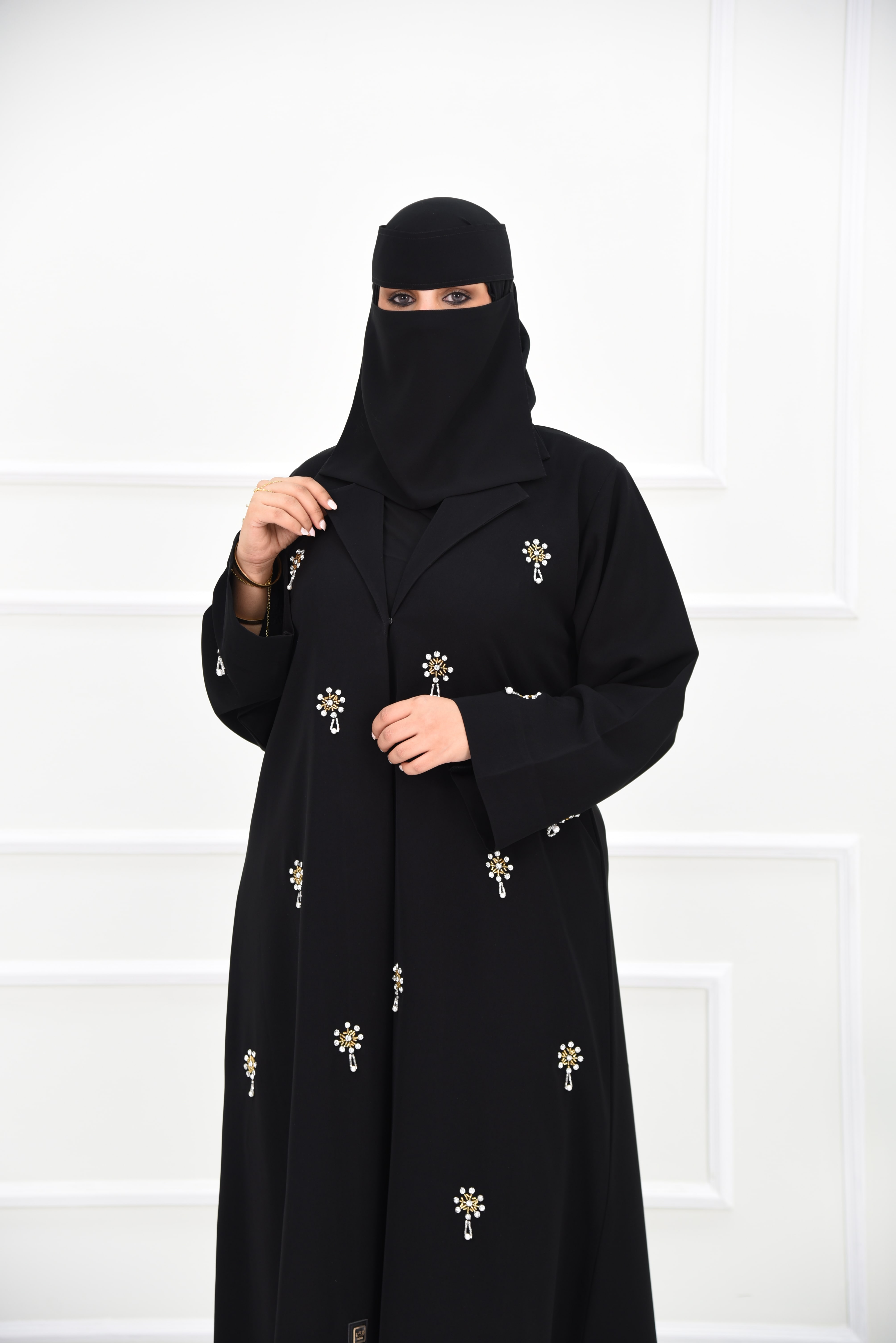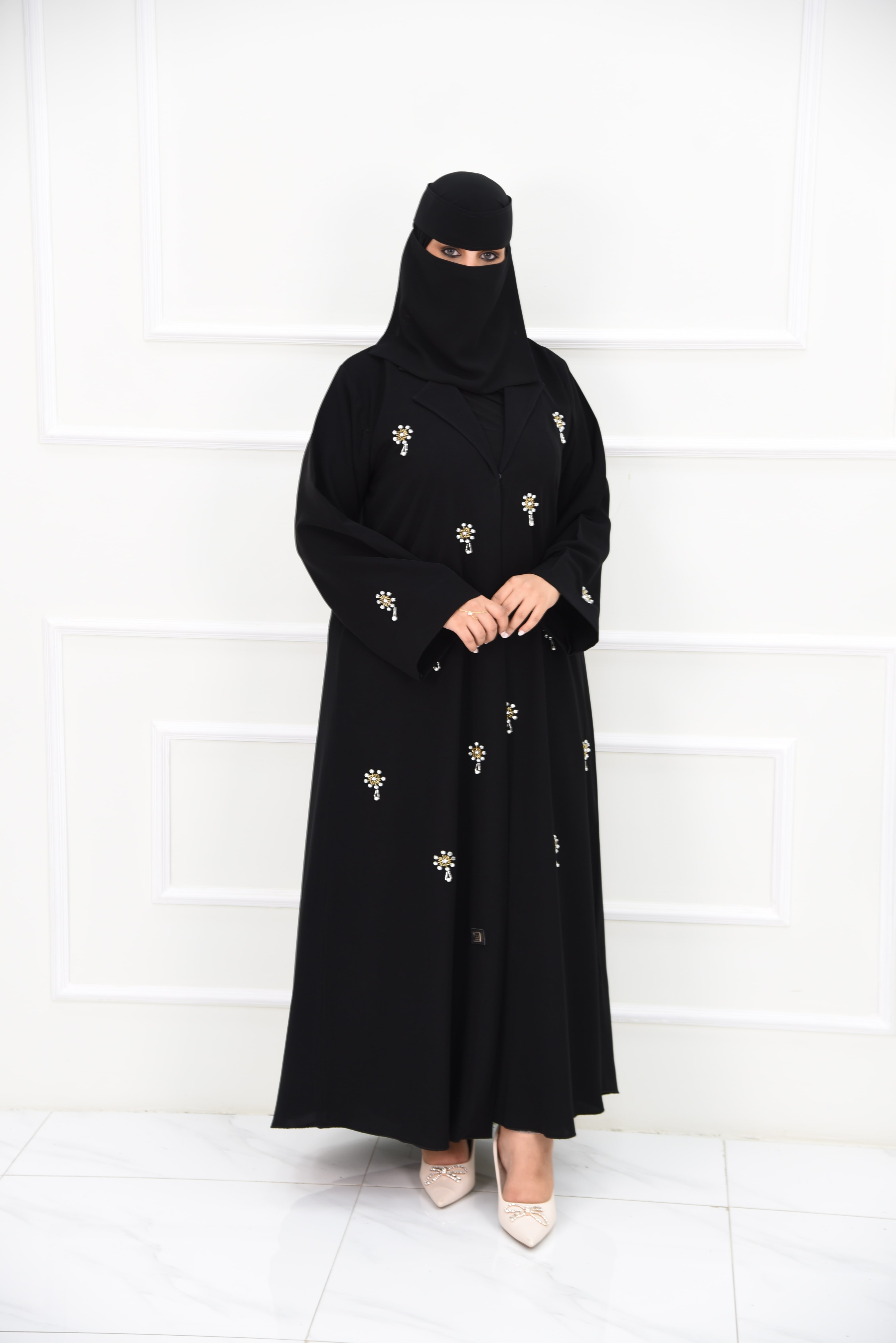 تأتي هذه العباية مرصعة بتصميم راقٍ من قماش الكريب الفاخر، مزينة بفصوص ذهبية لامعة وكريستالات مائية تضفي بريقًا يخطف الأنظار. تصميم الأكمام المربعة يمنح لمسة عصرية متجددة، لتكون هذه العباية المرصعة الخيار الأمثل للمناسبات والسهرات الفاخرة.