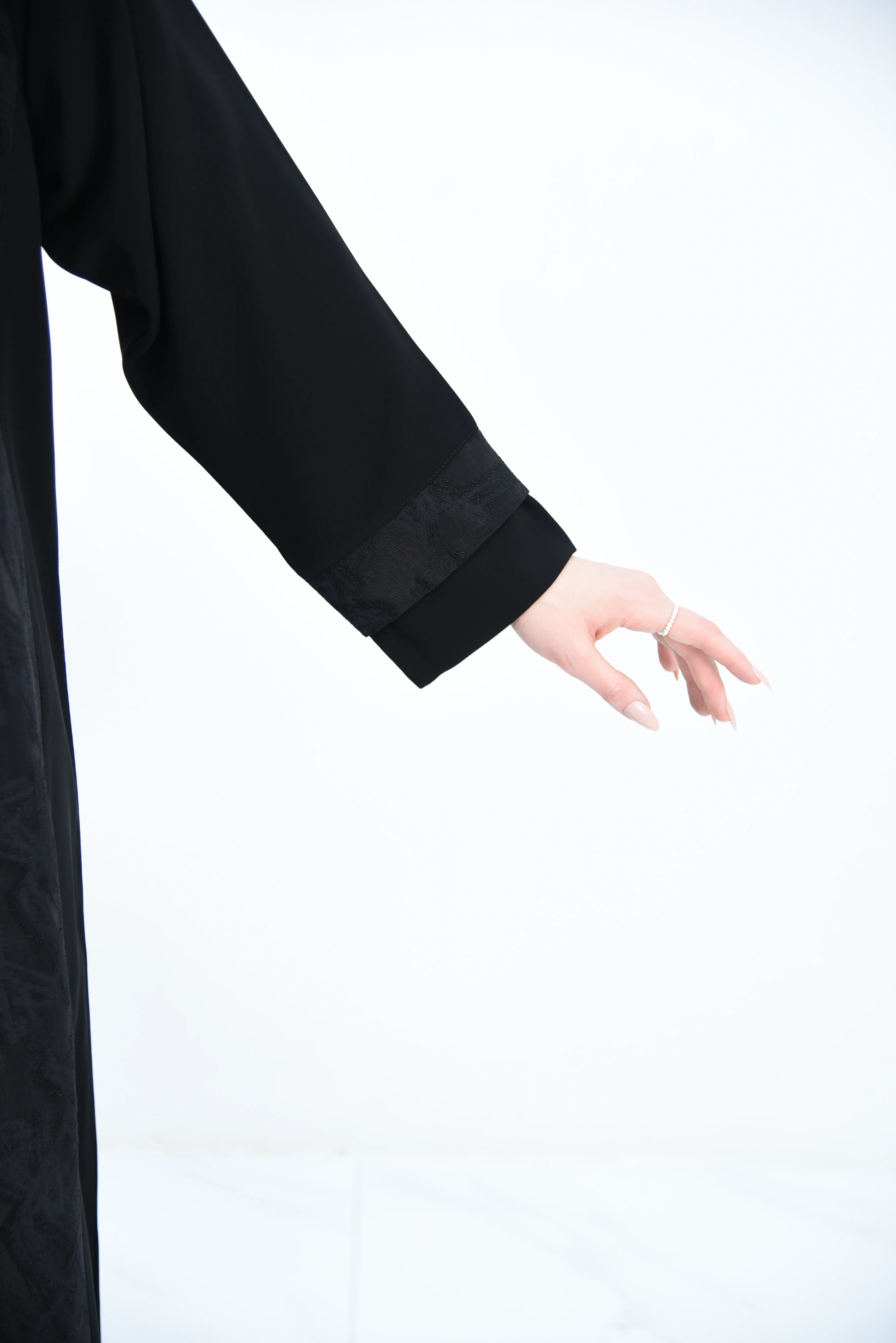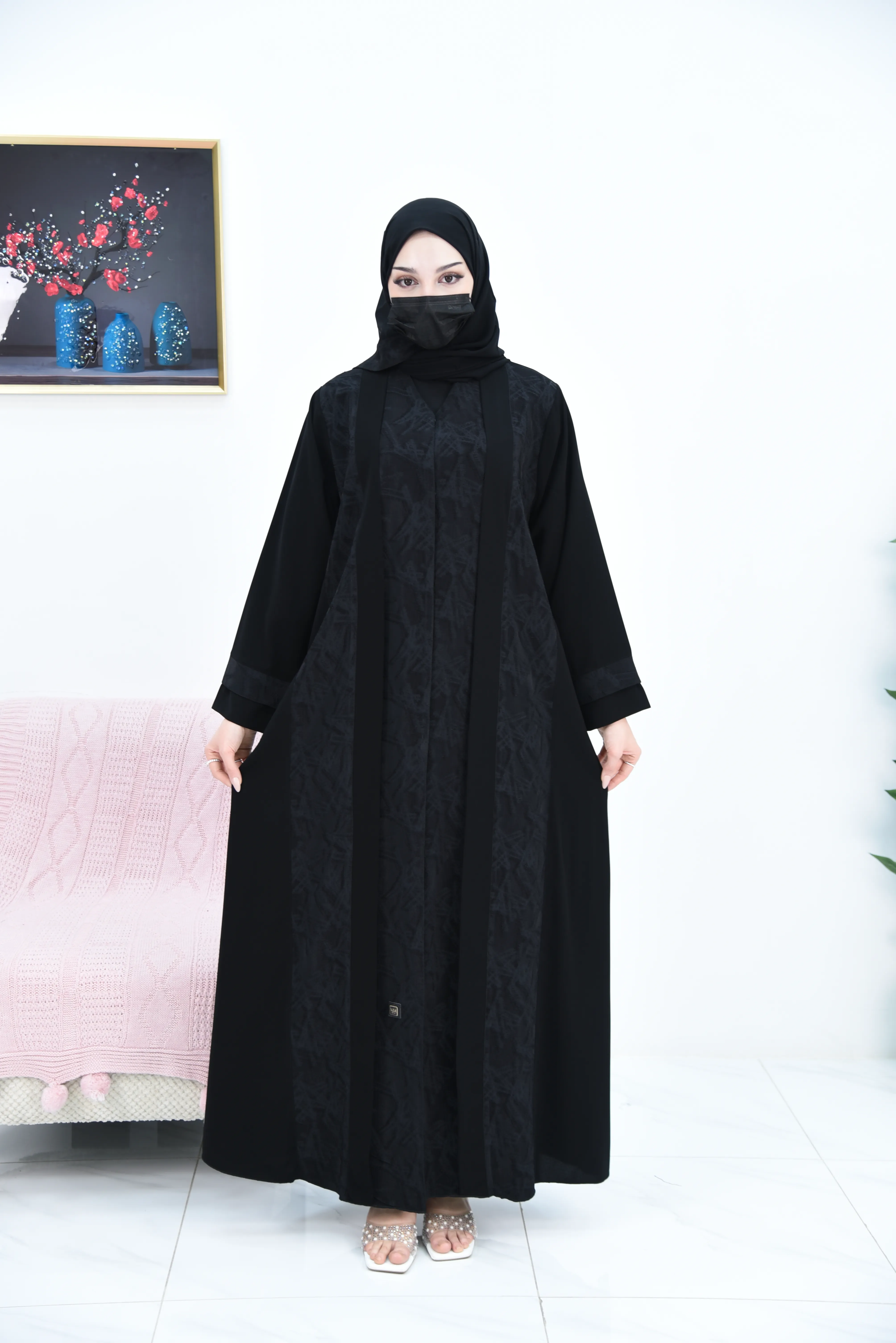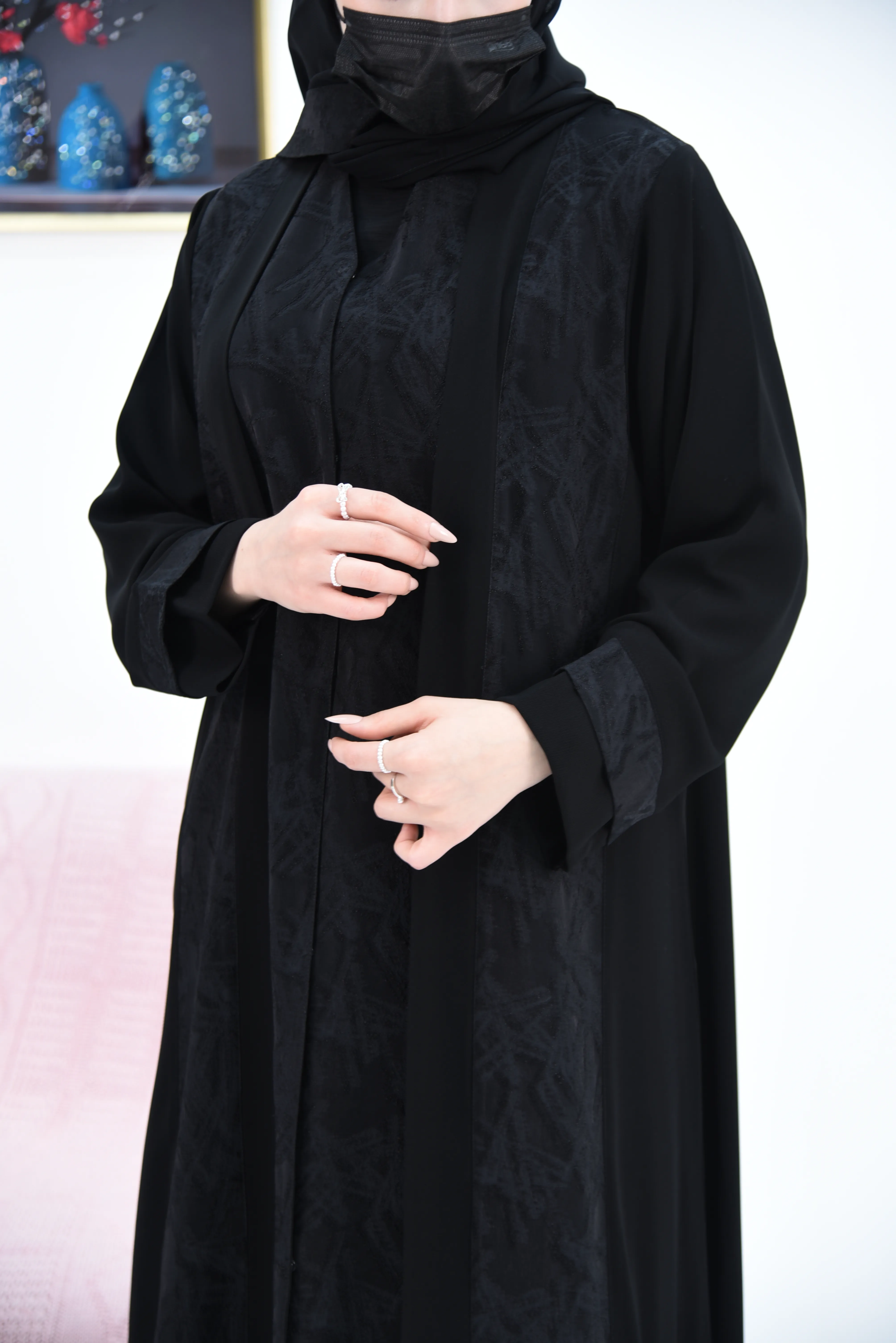 العباية مصممة بـ قصتين أمامية من قماش جاكار تركي،