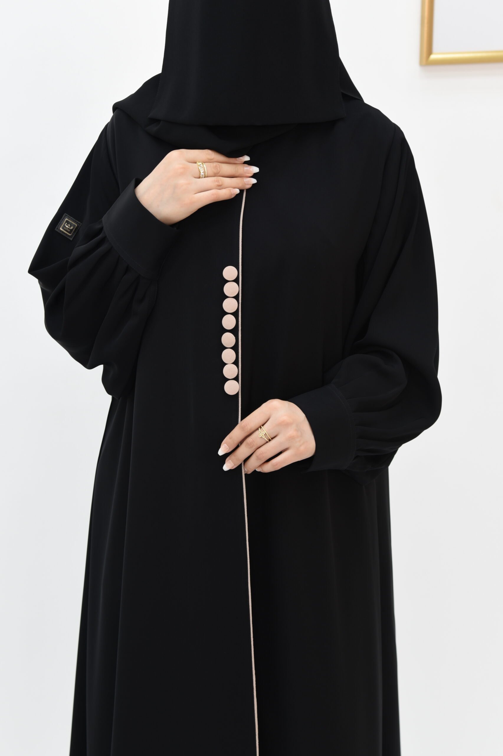 وصف العباية: عباية نص كلوش، مزينة بأزرار قماشية وحواف بيج أنيقة. تاتي بأكمام كسرات بنهاية كبك لتضفي لمسة من الرقي، وقماشها الحريري الناعم يضمن الراحة والفخامة.